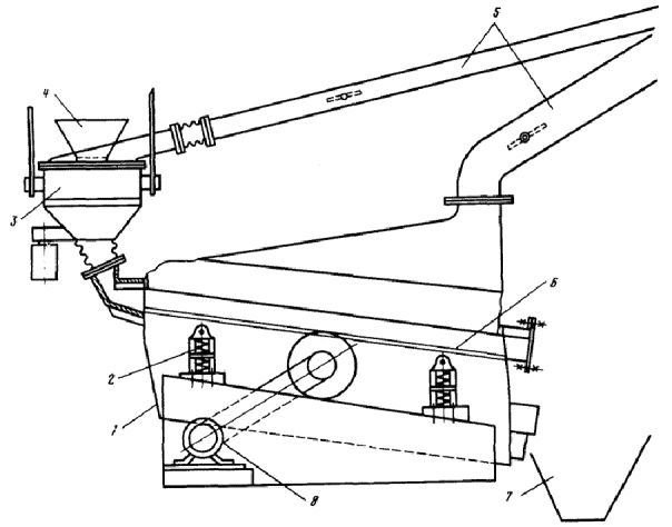 1 - виброгрохот; 2 - пружина; 3 - дезинтегратор; 4 - загрузочная воронка; 5 - воздуховоды; 6 - уступообразное сито виброгрохота; 7 - сборный лоток; 8 - привод виброгрохота