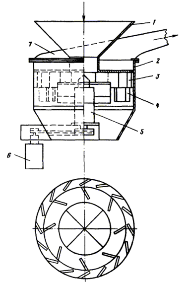 1 - загрузочная воронка; 2 - корпус; 3 - отражательные пластины; 4 - направляющие пластины; 5 - привод; 6 - электродвигатель; 7 - отсос