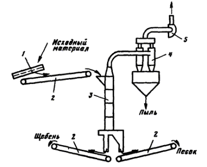 1 - виброгрохот; 2 - ленточные конвейеры; 3 - вертикальный пневмоклассификатор; 4 - циклоны; 5 - вентилятор