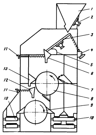 1 - питающий накопительный бункер; 2 - вибратор; 3 - вибролоток-питатель; 4 - механизм регулировки лотка; 5 - рессоры; 6, 12 - подвижные направляющие воронки; 7 - перекидная заслонка; 8 - верхний разделительный барабан; 9 - нижний разделительный барабан; 10 - транспортеры для продуктов обогащения; 11 - механизм изменения положения воронки; 13 - неподвижная воронка