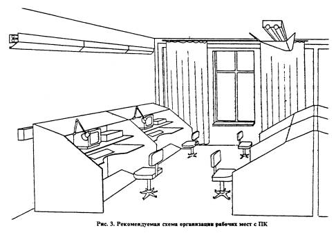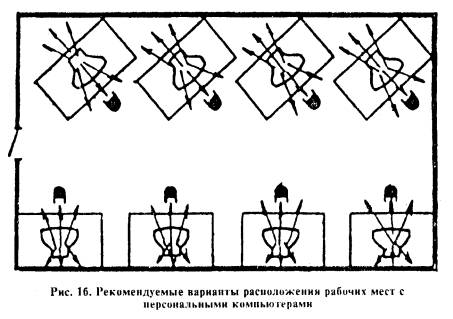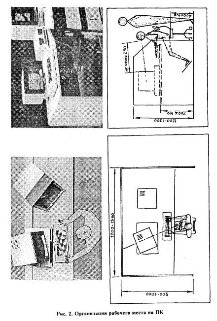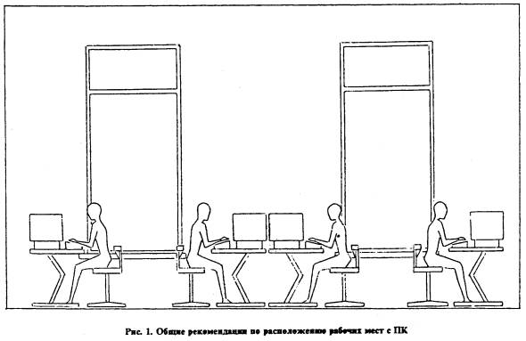 1.1. Требования настоящего документа распространяются на существующие, вновь проектируемые и реконструируемые здания и помещения полиграфических предприятий (организаций) и издательств, оснащенных видеотерминальной техникой (персональными компьютерами) в целях создания безопасных условий труда и рациональной организации трудовой деятельности пользователей персональных компьютеров. 1.2. Настоящие рекомендации направлены на улучшение условий труда, уменьшение утомляемости, повышение работоспособности и сохранение здоровья работающих на ПЭВМ (ПК). 1.3. Широкое внедрение в издательствах и типографиях компьютерной техники, в т.ч. ПЭВМ (ПК), обусловило значительное изменение характера труда, его содержания и условий, в которых он осуществляется. 1.4. ПЭВМ (ПК) может являться источником ряда вредных и опасных факторов производственной среды: электромагнитных полей (радиочастот), статического электричества. Нередко условия труда при работе на ПК усугубляются повышенными уровнями шума, неудовлетворительными микроклиматическими условиями и недостаточной освещенностью на фоне зрительного и нервно-эмоционального напряжения. 1.5. Работа на ПК может сопровождаться ограниченной двигательной активностью и монотонией. Условия труда пользователя, работающего с персональным компьютером, определяются: а) особенностями основных элементов рабочего места (пространственные параметры рабочего места и его элементов, которые должны соответствовать анатомо-физиологическим данным работающих; размещение элементов рабочего места относительно пользователя с учетом вида деятельности; б) условиями окружающей среды (освещение в помещении дисплейного зала и на рабочем месте, микроклимат, шум, специфические факторы, обусловленные особенностями средств отображения информации и т.д.; в) характеристиками информационного взаимодействия человека и ПК. 1.6. Усложнение функциональной структуры деятельности в связи с применением электронно-вычислительных систем, персональных компьютеров (ПК), предъявляет новые, иногда повышенные требования к организму человека. Недооценка роли человеческого фактора при проектировании и создании ПК неизбежно отражается на качественных и количественных показателях деятельности пользователей. 1.7. ПК в издательствах (редакциях) и на полиграфических предприятиях используются преимущественно при наборе текста (ввод информации) и в диалоговом режиме в процессах редактирования, верстки, правки текста и художественного оформления издания: - операции по вводу данных характеризуются высокой скоростью переработки информации, высоким темпом работы, низкой потребностью в обмене информацией и небольшой частотой принятия решений. Работа не требует большого умственного и зрительного напряжения, но сопровождается локальными мышечными нагрузками; - диалоговые виды работ (редактирование, правка, верстка и др.) характеризуются средней скоростью ввода информации, непостоянной (неритмичной) потребностью в обмене информацией с ПК, сопровождающейся принятием решений. 1.8. Особенностью работы на ПК является постоянное и значительное напряжение функций зрительного анализатора, обусловленное необходимостью различения объектов (символов, знаков и т.п.), при наличии на экране: строчной структуры экрана, мелькания изображений