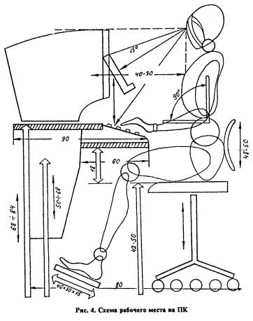 12.1.1. С целью улучшения условий труда, снижения нагрузок на опорно-двигательный аппарат и уменьшения влияния излучений ЭВМ на организм пользователей ПЭВМ (ПК) необходимо: - располагать рабочие места с ПК таким образом, чтобы естественный свет падал сбоку (с левой или с правой стороны) в зависимости от расположения столов, оборудования и оконных проемов (приложение 1, рис.1 - 4); - не допускать расположения рабочих мест с ПК в подвальных помещениях; - площадь одного рабочего места с ПЭВМ должна составлять не менее 6,0 кв.м, а объем не менее 20,0 куб.м. Не рекомендуется располагать рабочие места, оснащенные ПЭВМ (ПК), друг за другом. Задняя стенка монитора ПК не должна быть направлена (или соприкасаться) на пользователя ПК. Расстояние от стен не менее 1 м. 12.1.2. Рабочее место пользователя ПЭВМ (ПК) включает: рабочий стол, стул (кресло) и подставку для ног. 12.1.3. Рабочий стол обеспечивает оптимальное расстояние элементов ПЭВМ (экран, клавиатура, оригиналодержатель). С этой целью столешница имеет две раздельно регулируемых по высоте плоскости. Одна для размещения дисплея, вторая - для размещения клавиатуры, оригиналодержателя. Оптимальные размеры рабочей поверхности столешницы -1600 х 900 мм. Высота столешницы регулируется в пределах 68 - 84 см. Длина и ширина столешницы зависят от конструктивных особенностей размещаемого на них оборудования (величина экрана дисплея и их количества на одном рабочем месте, размеры клавиатуры, устройство оригиналодержателя). С целью оптимального размещения ПК на рабочем месте можно рекомендовать увеличить площадь столешницы за счет соединения друг с другом двух столов, или между двумя рабочими столами установить третий, более узкий по ширине. Это даст возможность оптимального размещения процессора, монитора и клавиатуры, а также снизит возможность воздействия уровней излучения ЭМП от монитора на пользователя. При больших размерах клавиатурных устройств (более 40 х 25) в столешнице предусматриваются устройства для изменения наклона клавиатуры. Покрытие поверхности стола должно быть однородным (серого, зеленого или коричневого цветов с коэффициентом отражения 20 - 25%). Передняя часть столешницы может иметь выступ для корпуса пользователя. Грани столешницы следует выполнять закругленными. 12.1.4. Для размещения материалов для обработки (оригиналов, документов) на рабочих местах устанавливают пюпитры, высота и наклон которых должны регулироваться. Пюпитры для документов выполняются подвижными с возможностью регулировки угла наклона в горизонтальной плоскости в пределах 30 - 70°. Наклон документа приблизительно равняется углу наклона экрана. 12.1.5. При размещении ПЭВМ на рабочем месте учитываются границы полей зрения пользователя, которые определяются движениями глаз и головы. Различают зоны зрительного наблюдения в вертикальной плоскости, ограниченные определенными углами, в которых располагаются экран ПК (45 - 60°), пюпитр (35 - 45°) и клавиатура. При периодическом наблюдении за экраном рекомендуется располагать элементы оборудования так, чтобы экран находился справа, клавиатура напротив правого плеча, а документы - в центре угла обзора. При постоянной работе экран должен быть расположен в центре поля обзора, документы слева на столе или на специальной подставке. 12.1.6. Клавиатура должна располагаться отдельно от экрана. Э