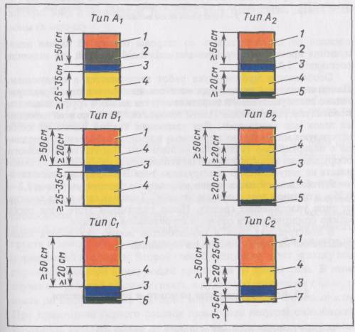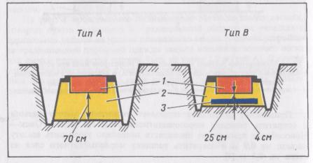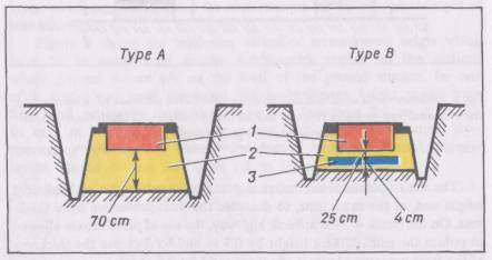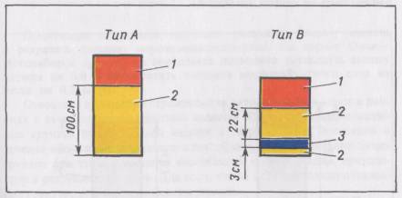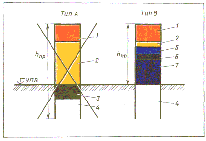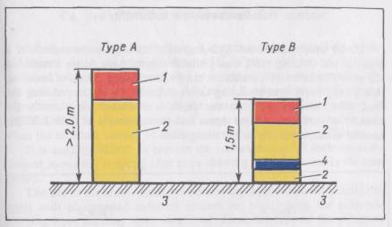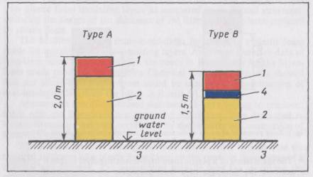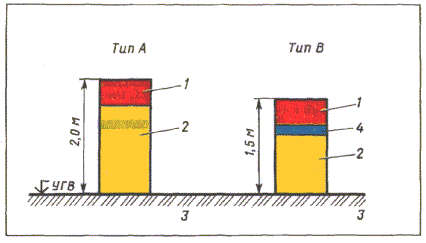 Fig. 1. Road pavement structures of the same frost resistance under conditions of Moscow: 1 - surfacing and base courses of road pavement; 2 - sand; 3 - Styrofoam The installation of a plastic foam heat-insulating layer makes it possible to decrease the thickness of a frost-protective layer significantly or to exclude it completely. Figure 1 shows the road pavement structures including the frost-protective layer made from sand (type A) and the heat-insulating layer made from plastic foam (type B). The structures meet the requirement as per strength and frost resistance under conditions of Moscow [5]. 1.2. Decrease in an embankment heightIn regions of a seasonal soil freezing the embankment height must have such value lest the overwetting of soil of a subgrade working layer should occur. The embankment height depends on the soils, which are included in the subgrade working layer [1]. The thickness of the working layer is assumed to be equal to 2/3 of a freezing depth but not less than 1.5 m from the pavement surface. The plastic foam heat-insulating layer makes it possible to reduce the working layer thickness at the expense of decreasing the freezing depth. Due to this, it is possible to exclude unfavourable soils from the working layer, which permits to lower the requirements for the minimum height of embankment. Figure 2 shows the minimum values of embankment heigts which have to be constructed in the Arkhangelsk region on the sections where ground waters are on the level of the ground surface. In case of a traditional road pavement the embankment height made from fine sand or sandy loam should be not less than 2.0 m (type A). In case of a road pavement structure with the heat-insulating layer preventing soil freezing below the ground surface, the embankment height should be not less than 1.5 m (type B).