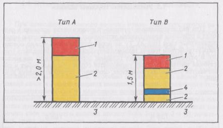 Fig. 2 Minimum values of embankment heights in the Arkhangelsk region when constructing the traditional road pavement (Type A) and the road pavement with plastic foam preventing soil freezing below the ground surface (Type B): 1 - road pavement; 2 - fine sand or sandy loam; 3 - silt sandy loam and silt loam; 4 - Styrofoam