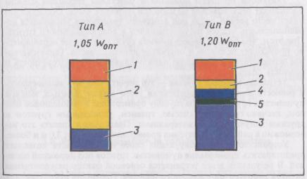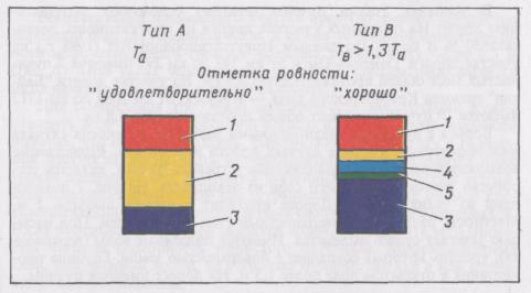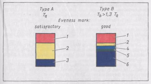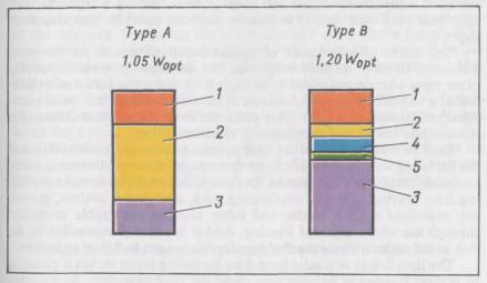 Fig. 5. Allowable values of moisture content of heavy silt loam at which the soil can be compacted to the specified values when constructing the traditional road pavement (Type A) and the road pavement with plastic foam (Type B): 1 - surfacing and base courses of road pavement; 2 - sand; 3 - heavy silty loam; 4 - Styrofoam; 5 - geotextile Under these conditions the soil frost heaving does not take place and only its shrinkage in summer period occurs. As a result, the soil is compacted additionally to the maximum density and even more [4]. Figure 5 shows maximum values of moisture content of heavy silty loam, at which it is possible to use this soil for constructing the subgrade working layer in case of a traditional road pavement structure with the asphalt surfacing (type A) and in case of installing the plastic foam heat-insulating layer in the structure (type D). 1.5. Improvement of the pavement durability and evennessDuring the road operation in the regions of a seasonal freezing, the all-round-year process of varying the density and moisture content of the heaving soils takes place. The process consists of the four periods: swelling in autumn, frost heaving in winter, soil subsidence when thawing in spring, and shrinkage when drying in summer. All-round-year variations of the density and moisture content are repeated during the whole service life of the structure. In this case, as a result of the subsidence and shrinkage of soils for a spring summer period, there can or cannot occur a restoration of their initial density achieved in constructing the road. In the latter case, losses of compaction of soils will occur if frost heaving is repeated year after year until their density in summer becomes equal to «everyday density» [3]. The above said processes of upheaval and subsidence of the road pavement develop nonuniformly over the carriageway area. Especially often these phenomena occur in spring, when under the action of vehicle traffic a nonuniformity of subsidence of the discompacted and water-saturated soil intensifies. As this takes place, the more the soil heave, the more nonuniform heaval and subsidence of the carriageway. Such an annual effect on the road pavement influences its durability and the surfacing evenness. To eliminate frost heaving means to increase the surfacing durability and evenness. In theory, this could by done be replacing frost heaving soils with conforming sand, sand-gravel mixture, gravel, soil stabilized with a binder and other nonfrost-susceptible materials through the whole depth of freezing. And it is actually impossible to do this in the regions where the freezing depth amounts to 3.0 m and more. The installation of plastic foam heat-insulating layers makes it possible to prevent freezing of heaving soils under the road pavement. As a consequence of this, the basic factor of losses of compaction of the subgrade working layer soils is removed. The density of the non-swelling and weakly-swelling soils actually does not change during road operation. The moisture content of soils compacted to the specified values does not also change. Under these conditions the bearing capacity of the working layer soils does not practically change from season to season. Only owing to this factor the surfacing durability increases approximately by 30 % as compared to the traditional solution of the structure. The service life of the structure using plastic foam will be considerably longer than the indicated value because there will be no annual nonuniform upheaval and subsidence of the road pavement, which determines to a large extent the structure durability.