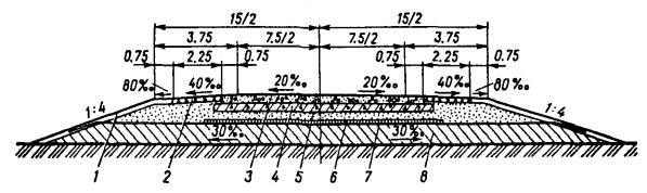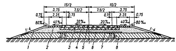3. Structures in the seasonal freezing regions3.1. Principles of designingThe road pavement structure should meet specifications as per strength, frost resistance and drainage [1]. The requirements as per frost resistance consist in that the value of soil heaving under the road pavement not exceed allowable values. In Russia, the value of soil heaving on the road, Lall, is assumed to be equal to 3 cm in case of a cast-in - place cement concrete pavement, 4 cm - in case of a precast pavement, 4 cm - in case of an asphalt surfacing of the road pavement of capital type, 6 cm - in case of an asphalt surfacing of the road pavement of lightened type. For roads of international class the allowable value of soil heave under the road pavement must not exceed 2 cm. The allowable value of soil heave is specified by a customer for constructing the road and this value should not be higher than the value presented above. The lower is the allowable value of soil heave, the better is the surfacing evenness during road operation and the longer is the road operation and the longer is the road pavement service life. An installation of the plastic foam heat-insulating layer permits to reduce the value of heave at the expense of decreasing the depth of subgrade freezing. The required thickness of the plastic foam insulating layer should be determined for the road pavement structure complying with the requirements for strength and drainage. The thickness of the plastic foam layer is specified with taking into account a service life of the road pavement between capital repairs, type of moistening the subgrade working layer [1], depth of the occurrence of underground waters from the bottom of the road pavement, and soils. When soils of various types occur within the freezing depth, it is necessary to consider in the design the parameters of the soil with the highest degree of heaving. The Styrofoam-insulated layer should be placed at the depth at least 0.5 m from the road surface lest the frequency of glazed frost formation on the road surface should exceed 10 % as compared to the section with a traditional road pavement structure [3]. 3.2. Structures for new constructionWhen designing, there may be 6 basic types of solution for road structures with the Styrofoam heat-insulating layer. The choice of a necessary solution depends on the road pavement structure designed on the strength and drainage conditions, and on its cost. Figure 8 shows the types of solutions for the road pavement. When the heaving soils thaw, there occurs their subsidence followed by squeezing out water. This water should be drained from under the road pavement. In this connection, in the structure of type «C2», it is necessary to use plastic foam boards with edges of straight shape in order that water could flow into the draining layer through the slits between the boards. The structure of type «B» is built with the use of plastic foam boards the edges of which are of stepped shape. The rest of the structures shown in Figure 8 are built with the use of plastic foam boards which have one or other shape of the edges depending on the source of water inflow and conditions of water drainage. The thickness of a draining layer depends on the filtration coefficient of sand. If it is equal to 3 m/day and more, the minimum thickness of a draining layer in the structure of type «C2» is 20 cm, if the filtration coefficient is less than 3 m/day, the thickness of a draining layer amounts to 25 cm. Figure 9 shows a cross section of the road pavement structure of type «C1» (sizes are given in meters). The Omsk - Novosibirsk highway has such a structure, [4]. The width of the plastic foam-insulated layer should be greater than that of the carriageway by 0.5 m (0.5 m) - 1.5 m (2.0 m) for insulating the soils under the road pavement against the cold effect from the side of shoulders. The values in brackets are assumed in case of preventing soil freezing under the road pavement. Peculiarities of fulfilling construction jobs are as follows. Fig. 8. Basic types of road pavement structures with the Styrofoam heat-insulating layer used in new construction: 1 - surfacing and base courses of road pavement; 2 - cement concrete base course; 3 - Styrofoam; 4 - sand draining layer; 5 - geotextile interlayer against silting; 6 - geotextile draining interlayer; 7 - sand levelling course Fig. 9. Cross section of the road structure, Type C: 1 - grass sown on the 0.15 m layer of soil; 2 - crushed stone (0.1 m) bound with bitumen (1.5 l/m2); 3 - cement concrete (0.24 m); 4 - crushed stone stabilized with 6 % of cement (0.21 m); 5 - sand (0.20 m); 6 - Styrofoam (0.10 m); 7 - «dornit» geotextile; 8 - soil (light silty clay) The plastic foam boards are placed on sand or geotextile. The sand is preliminarily compacted and levelled, the subgrade soil under the geotextile is compacted and levelled as well. The boards should be rested upon the whole area of sand and geotextile. To retain each board, at least 2 wooden stakes driven flush with the surface of the heat-insulating layer are used. Building equipment is not allowed to work directly on the plastic foam heat-insulating layer. In structures of types «B» and «C», the first layer of sand over the Styrofoam boards should be filled at least as thick as 0.2 - 0.25 m in the dense body using a method «from yourself. The thickness of sand layer depends on the types of compacting equipment. The sand layer being compacted, it is possible to use conventional methods of construction. In structures of type «A», cement concrete may be laid directly on the Styrofoam boards. 3.3. Structures for road repair and reconstructionRepair (reconstruction) of a heaving road section should be performed so that after completing construction works the following requirements be fulfilled: soil heave at places where a heaving section adjoins a sound one should be equal to the heaving value of the latter; soil heave in the middle part of a