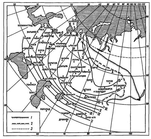where nр = number of structural layers of the road pavement without the heat-insulating layer; hp(i) = thickness of a separate layer, m; lp(i) - coefficients of the heat-conductivity of separate layers in a frozen state. The design should include actual measured values of lp(i). In the absence of such data the tabulated values lp(i) [2] may be used in the design. These values for some materials are given below: 1.74 W/(m×K) for cement concrete; 1.40 W/(m×K) for dense asphalt concrete; 1.25 W/(m×K) for porous asphalt concrete; 1.86 W/(m×K) for crushed granite; 1.39 W/(m×K) for crushed limestone; 2.10 W/(m×K) for sand-gravel; 2.00 W/(m×K) for sand. 3. The soil heaving index, Ch, is determined from Table 2. The following soils are referred to the medium heaving ones: sandy loam, light sandy clay loam, heavy sandy clay loam, clay. The highly heaving soils are as follows: silty sand, silty sandy loam, heavy silty loam. The extremely heaving soils are as follows: silty sandy loam with a sand particle content at least 20 % by weight and light silty loam. When dealing with soils of specific types and needing a higher accuracy, the heaving index should be determined from the results of soil test in compliance with GOST 28622-90. 4. The coefficient Cp that takes into account the influence of the weight of the road pavement and subgrade frozen courses on the soil heave value is assessed. This coefficient is found from Table 3 regarding a thickness of the road pavement (hp, m) and an allowable freezing depth of the subgrade (hfr(all), cm). When values of the road pavement thickness are lower or higher than those given in Table 3, the value of Cp should be established by interpolating between appropriate values. At first, one should assume the value of Cp that corresponds to an allowable freezing depth of the subgrade in a range of 0 to 50 (100). The value of coefficient Km must be reduced by 5 % if the road is located in south subzone II of the road - climatic zone, by 10 % if the road is located in road - climatic zone III and by 15 % if the road is located in road - climatic zone IV [1]. 5. Using Table 4, the following coefficient values are found: Kp = coefficient taking account of the road pavement service life; Km = coefficient considering the type of moistening the subgrade working layer. 6. The required thermal resistance of the road pavement (Rp(req), m2×K/W) is determined from the nomogram (Fig. 11). Proceed as follows: Fig. 10. Map with isolines for determining the required values for thermal resistance of road pavement: I - Х - numbers of isolines; 1 - boundary of the continuous occurrence of perennially frozen soils; 2 - ditto, of the insular occurrence (up to 25 m in depth); 3 - Arctic Circle