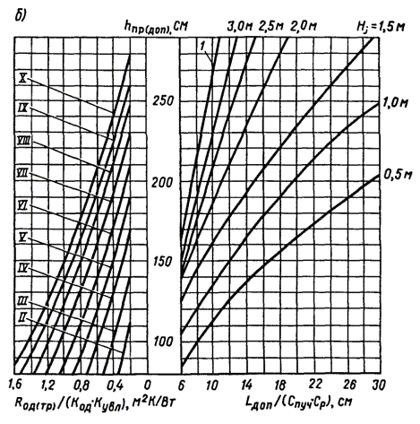 Рис. 11. Номограммы для определения требуемого термического сопротивления дорожной одежды Rод(тр) при значениях Lдоп / (СпучСр) от 0 до 6 см (а) и от 6 до 30 см (б): I - X - номера изолиний на карте (см. рис. 10); 1 - кривая расчета для 1-го и 2-го типов увлажнения рабочего слоя земляного полотна 6. Устанавливают по номограмме (см. рис. 11) требуемое термическое сопротивление дорожной одежды Rод(тр). Для этого выполняют следующие операции: вычисляют значение выражения Lдоп / (СпучСр); определяют по номограмме значение hпр(доп) в зависимости от значения выражения Lдоп / (СпучСр), типа увлажнения рабочего слоя земляного полотна и глубины залегания подземных вод (Hg, м) от низа дорожной одежды; Таблица 2