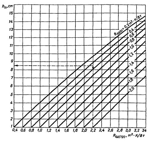уточняют по табл. 3 значение Ср в зависимости от hпр(доп); вновь вычисляют значение выражения Lдоп / (СпучСр), устанавливают по номограмме значение выражения Rод(тр) / (Код ´ Кувл), в зависимости от Lдоп / (СпучСр), типа увлажнения рабочего слоя земляного полотна и глубины залегания подземных вод (Нg) от низа дорожной одежды и номера изолинии на карте (см. рис. 10), которая проходит через рассматриваемый участок дороги; вводят в выражение Rод(тр) / (КодКувл) значения коэффициентов Код и Кувл и вычисляют искомую величину Rод(тр). При глубине залегания подземных вод на участке дороги, отличающейся от указанных на номограмме, нужно определять два значения Rод(тр): одно - при значении Нg на номограмме более, а другое - при значении Нg на номограмме менее глубины залегания подземных вод на участке. Искомое значение Rод(тр) устанавливают методом интерполяции между соответствующими величинами. Рис. 12. График для определения необходимой толщины слоя пенопласта Styrofoam: Rод(тр) - требуемое термическое сопротивление дорожной одежды; Rод(о) - термическое сопротивление дорожной одежды без слоя пенопласта 7. Устанавливают по графику (рис. 12) необходимую толщину слоя пенопласта hп, в зависимости от Rод(о) и Rод(тр). При расположении рассматриваемого участка дороги между изолиниями на карте (см. рис. 10) определяют два значения hп, соответствующих этим изолиниям, искомую толщину теплоизолирующего слоя определяют методом интерполяции в зависимости от расстояния от рассматриваемого участка до одной из изолиний. 3.5. Расчет величины пучения грунтаДля определения по форм. 1 длины переходной зоны с переменной толщиной слоя пенопласта нужно знать величину hпуч(o) пучения грунта на «здоровом» участке дороги. Значение этой величины устанавливают по номограмме (см. рис. 11). По сравнению с изложенным в п. 3.4 решается обратная задача. Искомым значением является Lдоп = hпуч(о) при известном значении Rод(тр), равном термическому сопротивлению дорожной одежды на «здоровом» участке дороги. 4. КОНСТРУКЦИИ В РАЙОНАХ С ВЕЧНОМЕРЗЛЫМИ ГРУНТАМИ4.1. Принципы проектированияВ районах с вечномерзлыми грунтами устраивают дороги с теплоизолирующими слоями из пенопласта для того, чтобы обеспечить прочность и устойчивость земляного полотна. Это достигается благодаря сохранению грунтов естественного основания в твердомерзлом состоянии (1-й класс конструкций), а также этому же мероприятию в сочетании с сохранением грунтов насыпи в твердомерзлом состоянии (2-й класс конструкций). Одним из условий обеспечения такого состояния грунтов является устройство земляного полотна зимой, когда основание насыпи промерзает на глубину более 30 см. Другим условием является устройство теплоизолирующего слоя из пенопласта, который предохраняет грунты от оттаивания в течение всего срока службы дороги. Обычно этот срок равен 30 годам. Для сохранения грунтов в твердомерзлом состоянии в течение указанного срока нужно принимать в качестве расчетного года наиболее теплый год повторяемостью 1 раз в 30 лет. Для установления этого года нужно определить суммы положительных градусо-суток, отрицательных градусо-суток и их результирующее значение для каждого года за срок не менее 30 лет. По этим данным устанавливают искомый наиболее теплый год. Толщину слоя пенопласта, необходимую для сохранения грунтов в твердомерзлом сос