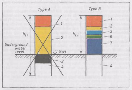 Fig. 7. Road pavement with a frost-protective layer (Type A) and a plastic-foam heat-insulating layer (Type B) considered when solving the problem of removing frost heaves from the road: 1 - surfacing and base courses of road pavement; 2 - sand; 3 - gravel; 4 - silly sandy loam; 5 - Styrofoam; 6 - geotextile; 7 - soil of the existing embankment; hfr - freezing depth The reconstruction of the heaving road section provides for building the road pavement 0.5 m thick. If an additional frost-protective layer is installed, its thickness should be more than 0.5 m (type A). Under such conditions, the road pavement bottom is located below the ground surface in the area of perched water. To provide the required durability of the structure, it is necessary to drain water from the road pavement courses and the upper layers of the subgrade. These requirements cannot be fulfilled. It is impossible to drain water in the flat land, when a portion of the frost-protective layer is below the ground water level. Therefore, under the above said conditions the frost-protective layer for eliminating frost heaves should not be installed. The frost-protective layer made from granular materials has much more disadvantages. It will be filled with water below the ground level, as a result of which the bearing capacity of the granular material will decrease. The frost-protective layer filled with water will not eliminate frost heaving, for there will occur ice formation. The structure including a plastic foam heat-insulating layer (type B) has no drawbacks indicated and allows to remove frost heaves from the roads. In regions of ever frozen soils, there may be such situations when it is impossible to manage without using plastic foam. One of these situations is a forced construction of the subgrade in the low fill due to the territory relief [6]. If the plastic foam heat-insulating layer is not installed, there will occur a thawing of ice-saturated soils under the embankment bottom, which will result in a road failure. The use of plastic foam makes it possible to prevent a thawing of soils and to save the road. 2. Determination of the required plastic foam grade2.1. Conditions of the plastic foam performance in the structurePlastic foam in the structure is subjected to the effect of force and natural factors. The action of short-term repeated loads resulted from vehicle traffic causes compression deformation at bending of plastic foam. The effect of natural factors on the plastic foam layer is manifested in freezing and thawing, in moistening and drying, in nonuniform heaval and subsidence of the heat-insulating layer. Under conditions of Russia, the temperature gradient through the depth of the plastic foam layer amounts to 1.5 deg/cm and more. The action of loads from vehicle traffic takes place under conditions when the upper part of the plastic foam layer is in a thawed state and the lower one is frozen, and vice versa. Under such combined action of force and natural factors, it is difficult to model the plastic foam performance in the structure. The main mechanism of a plastic foam failure is the material fatigue. The basic criterion for specifying a plastic foam grade is the results of field observations. 2.2. Tests on roadsIn 1983 - 1999 according to the indication of Ministry of Construction, the tests of Styrofoam of grade HI-50, were conducted on the Omsk - Novosibirsk highway (region of seasonal freezing) and on the Urengoy - 185 road (region of perennially frozen soils). The section of the Omsk - Novosibirsk highway with the Styrofoam heat-insulating layers is in the area of the town of Chulym [4]. This area is characterized by severe freezing winters, hot summers and unfavourable soil hydrological conditions. According to Hydrometeorological Center, the air temperature can be as low as -50 °C in winter and as high as +38 °С in summer. In the period of testing plastic foam the sum of negative degree-days was from 1133 to 2575 for one winter. The road on the Styrofoam-insulated section runs across the territory without surface runoff. The perched water is found at the depth of 0.5 to 1.7 m from the ground surface. The subgrade made from light silty clay is in the embankment 1.65 m high. The same is under the embankment bottom. The road pavement of the trial section has a cement concrete pavement (Fig. 9). Styrofoam insulation has been in the road pavement for 12 years. In order to assess the durability of Styrofoam, the plastic foam samples were taken from the trial section of Omsk - Novosibirsk highway. The samples were tested by the Test Center «Stroypolymertest». The results of the test are presented in Table 1. The data of Table 1 make it possible to conclude that the Styrofoam properties remained actually the same during the road service, with the exception of some degree of its compression during the construction of the road pavement. The test results showed that Styrofoam of HI-050 grade could be applied for installing heat-insulating layers on the roads. At present the nomenclature of plastic foams produced by The Dow Chemical Company has changed. Instead of HI-50 grade, the Floormate 500 grade should be taken. Table 1