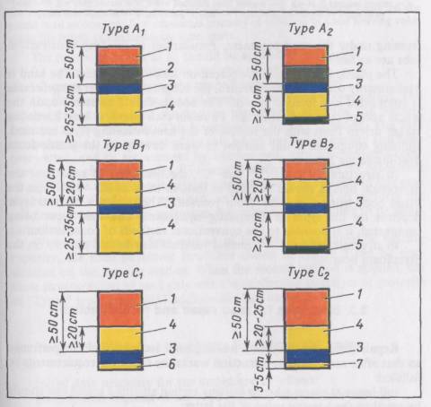 3. КОНСТРУКЦИИ В РАЙОНАХ С СЕЗОННЫМ ПРОМЕРЗАНИЕМ3.1. Принципы проектированияКонструкция дорожной одежды должна удовлетворять нормативным требованиям по прочности, морозоустойчивости и дренированию [1]. В соответствии с требованиями по морозоустойчивости необходимо, чтобы пучение грунтов под дорожной одеждой не превышало допустимых значений. В России допускают на дорогах пучение грунтов Lдоп = 3 см при устройстве цементобетонного монолитного покрытия; L = 4 см при устройстве сборного покрытия, а также при устройстве дорожной одежды капитального типа с асфальтобетонным покрытием; L = 6 см при устройстве дорожной одежды облегченного типа с асфальтобетонным покрытием. Для дорог международного класса допустимое пучение грунтов под дорожной одеждой не должно превышать 2 см. Допустимое значение пучения грунтов определяет заказчик строительства автомобильной дороги; оно не должно превышать значений, приведенных выше. Чем меньше допустимое значение пучения грунтов, тем лучше ровность покрытия в процессе эксплуатации дороги и больше срок службы дорожной одежды. Устройство теплоизолирующего слоя из пенопласта позволяет уменьшить морозное пучение грунта благодаря снижению глубины промерзания земляного полотна. Определение необходимой толщины слоя пенопласта нужно проводить для конструкции дорожной одежды, удовлетворяющей требованиям по прочности и дренированию. Толщину пенопласта устанавливают с учетом срока службы дорожной одежды между капитальными ремонтами, типа увлажнения рабочего слоя земляного полотна [1], глубины залегания подземных вод от низа дорожной одежды и грунтов. При залегании грунтов разных типов в пределах глубины промерзания нужно включать в расчет показатели грунта с наибольшей степенью пучинистости. Теплоизолирующий слой из пенопласта Styrofoam нужно располагать на глубине не менее 0,5 м от поверхности покрытия для того, чтобы частота образования гололедицы на покрытии не превышала 10 % по сравнению с участком, имеющим традиционную конструкцию дорожной одежды [3]. 3.2. Конструкции при новом строительствеПри проектировании можно использовать 6 основных типов решений дорожной конструкции с теплоизолирующим слоем из пенопласта Styrofoam. Нужное решение выбирают в зависимости от конструкции дорожной одежды, запроектированной по условиям обеспечения прочности и дренирования, и стоимости конструкции (рис. 8). При оттаивании пучинистых грунтов происходит их осадка с отжатием воды. Эта вода должна отводиться из-под дорожной одежды. Поэтому в конструкции типа С2 нужно применять плиты пенопласта, имеющие прямую форму кромки для того, чтобы вода могла поступать в дренирующий слой через щели между плитами. В конструкции типа В применяют плиты пенопласта, имеющие паз-выступ или ступенчатую форму кромки. В этом случае теплоизолирующий слой из пенопласта выполняет полностью или частично функцию гидроизолирующего слоя. В зависимости от источника поступления воды и условий ее отвода из дорожной одежды применяют плиты с соответствующей формой кромки для остальных конструкций, представленных на рис. 8. Толщина дренирующего слоя зависит от коэффициента фильтрации песка. При 3 м/сут и более минимальная толщина дренирующего слоя в конструкции типа С2 составляет 20 см, при коэффициенте фильтрации менее 3 м/сут - 25 см. На рис.