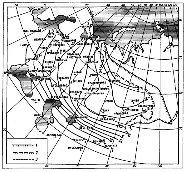 where Itz = length of the transition zone, m; Lall = allowable value of soil heave on the repaired (reconstructed) road section, cm; Hh(о) = soil heaving value on the sound road section, cm; Itz = admissible intensity of variation in a soil heaving value along the length of the transition zone, cm/m. The following values of Itz should be applied in the design: 0.1 cm/m - when laying the concrete pavement; 0.2 cm/m - when laying the asphalt concrete pavement. On the heaving section, the soil loses its density and is overwetted. The repair (reconstruction) of this section begins with restoring the bearing capacity of the subgrade. This is performed by two methods. The first method includes the removal of the soil, which has lost its density and been overwetted, and its replacement by another soil, with a subsequent compaction to a standart density. The second method involves the placement of a geotextile reinforcing interlayer under the road pavement. In this case the removal of soil is not required, and it is only needed to perform the soil compaction up to the maximum magnitude corresponding to its moisture content. When applying the first method of improving the subgrade bearing capacity, the road pavement structures shown in Figure 8 can be constructed on the heaving section. When the second method is applied, the same structures can be used only with the reinforcing interlayer of geotextile of «Typar» type, grade 3857 additionally laid under them. 3.4. Design of the plastic foam layer thicknessInitial data necessary for the design are as follows: geographical location of the road section under consideration; road pavement structure (name and thickness of layers) without a heat-insulating layer, which is required according to the strength and drainage conditions; type of moistening the subgrade working layer (type 1, 2 or 3) and depth of the ground water occurrence from the road pavement bottom; name of the subgrade soil. The design of the heat-insulating layer (hf), cm, is carried out in the following order: 1. The number of isoline that runs along the section considered is determined from the map (Fig 10). When the road section is between two isolines, the numbers of both of them are found. 2. Thermal resistance of the road pavement without a heat-insulating layer (Rp(0) m2×K/W) is computed: