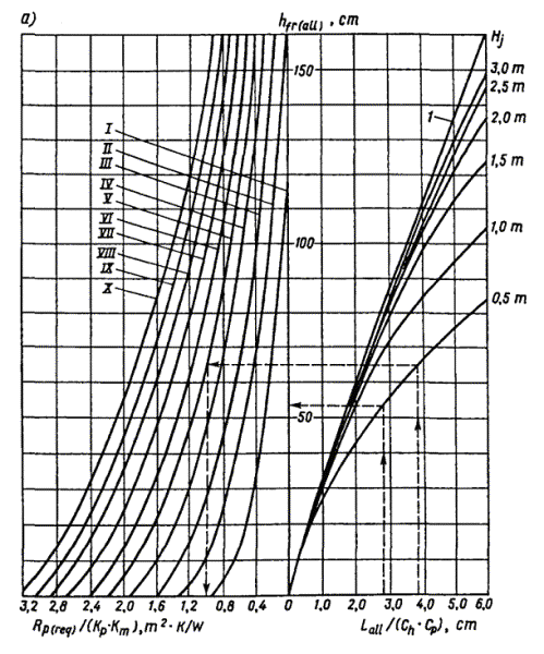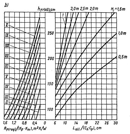 Fig. 11. Nomogram for determining the required thermal resistance of road pavement Rp(req) at La / (ChСp) equal to 0 to 6 cm and from 6 to 30 cm: I - Х - isoline numbers on the map (Fig. 10); 1 - design curve for types 1 and 2 of moistening the subgrade working layer compute the value of Lall / (ChСp); determine the value of hfr(all) from the nomogram depending on Lall / (ChСp), type of moistening the subgrade working layer, and depth of ground water occurrence, (Hl, m) from the road pavement bottom; define more exactly the value of Cp depending on hfr(all) using Table 3; estimate again the value of Lall / (ChСp); determine the value of Rp(req) / (KpKm) from the nomogram depending on Lall / (ChСp), type of moistening the subgrade working layer, and depth of ground water level (Hg) from the road pavement bottom as well as the number of the isoline on the map (Fig. 10) that goes through the road section considered; Table 2