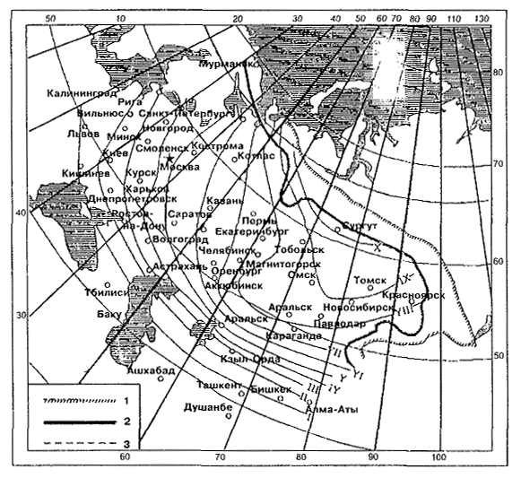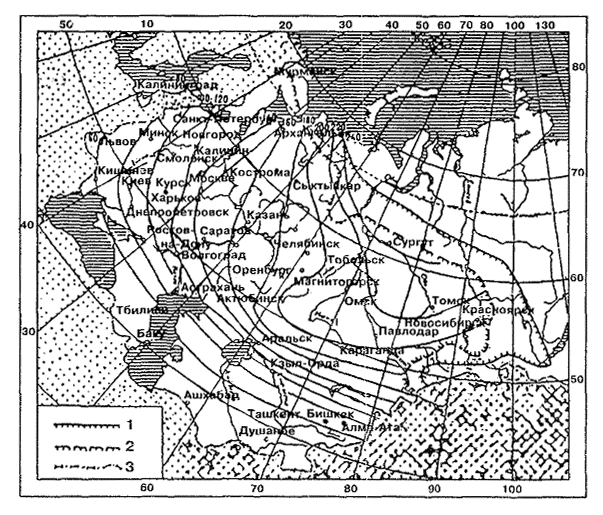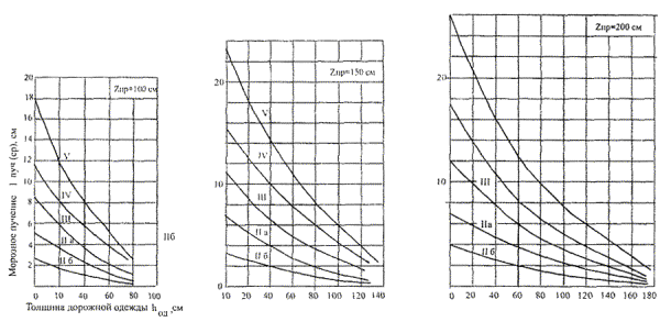 где zпр(ср) - средняя глубина промерзания для данного района, устанавливаемая при помощи карт изолиний (рис. П.1.4). При глубине промерзания дорожной конструкции zпр до 2 м lпуч.ср устанавливают по графикам рис. 4.3. При zпр от 2,0 до 3,0 м lпуч.ср вычисляют по формуле: