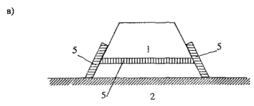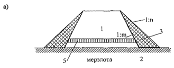 3.2.1.4. Определение необходимой толщины слоя «Пеноплэкса», включаемого в конструкцию, запроектированную по условию сохранения мерзлоты, производится подбором по формулам п. 3.2.1.3 при условии, что количество, толщина и теплофизические характеристики остальных слоев конструкции определены по тем или иным соображениям (высота насыпи, прочность дорожной одежды, технологические ограничения и пр.). 3.2.1.5. При выборе оптимальной конструкции следует учитывать, что наибольший эффект теплозащиты мерзлого массива достигается в том случае, если слой «Пеноплэкса» является предпоследним (N-1), а в последнем слое используется грунт с высокой влажностью (например, торф). 3.2.1.6. Расчет требуемой для сохранения мерзлоты теплоизоляции конструкции со стороны откосных частей осуществляется по специальной методике, основанной на двумерной теплофизической задаче. Решение реализуется с помощью программы ПЭВМ. 3.2.2. Учет влияния термоизоляционного слоя из «Пеноплэкса» на прочность дорожной одежды3.2.2.1. При расположении прослойки из «Пеноплэкса» с защищаемым его мерзлым грунтом на глубине более 1,5 м от поверхности покрытия наличие мерзлого слоя с высоким модулем упругости и низкомодульного термоизолирующего слоя в расчете дорожной одежды на прочность не учитывается. В этом случае в качестве расчетного модуля грунта принимается модуль упругости грунта, расположенного над прослойкой. 3.2.2.2. При расположении прослойки и поверхности мерзлого грунта ближе 1,5 м от поверхности покрытия для учета их влияния на напряженное состояние в расчете принимают модуль подстилающего грунта, определяемый по формуле: где Ем - модуль мерзлой толщи; ЕТ - модуль прослойки; hм - условная расчетная толщина мерзлого слоя, см; hТ - толщина прослойки, см; 3.2.2.3. Расчетную толщину мерзлого слоя hм определяют по формуле: hм = 1,5 - Z, см, (3.3) где Z - расстояние от поверхности покрытия до поверхности толщи, сохраняемой в мерзлом состоянии, см; 3.2.2.4. Если значение модуля упругости, определяемое по формуле (3.2), окажется больше модуля грунта, расположенного над прослойкой, за расчетный модуль грунтового массива принимается модуль грунта, расположенного над прослойкой. 3.2.3. Схемы конструктивных решений дорожных конструкций, сооружаемых с сохранением грунта в мерзлом состоянии, с использованием термоизолирующего слоя из «Пеноплэкса»3.2.3.1. В качестве принципиальных вариантов конструктивных решений, предусматриваемых при сохранении грунта в основании или нижней части земляного полотна в мерзлом состоянии, могут предусматриваться (рис. 3.2): - устройство термоизолирующего слоя из «Пеноплэкса» на поверхности основания или в теле насыпи с укрытием (присыпкой) откосной части основной насыпи торфопесчаной смесью. При этом откос присыпки назначается менее крутым, чем откос основной насыпи (рис. 3.2.а); - устройство термоизолирующего слоя из «Пеноплэкса» на поверхности основания или в теле насыпи с устройством теплозащитных берм (призм) из торфа (рис. 3.2.б); - устройство термоизолирующего слоя из «Пеноплэкса» на поверхности основания или в теле насыпи с устройством теплозащитных слоев из «Пеноплэкса» на откосах (рис. 3.2.в).