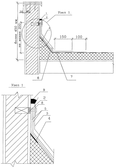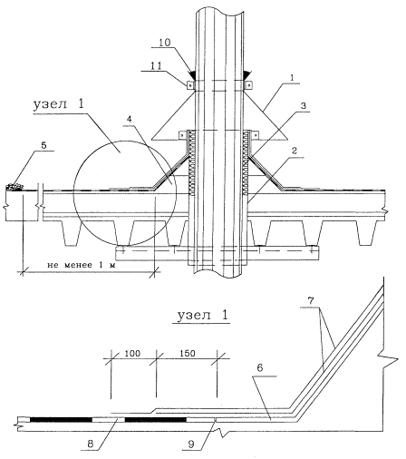 2 ОРГАНИЗАЦИЯ И ТЕХНОЛОГИЯ СТРОИТЕЛЬНОГО ПРОЦЕССА2.1 Перед началом работ по ремонту кровли в местах примыканий проводится освидетельствование кровли и по результатам обследования составляется ведомость дефектов кровли и объемов ремонтных работ. 2.2 Ремонт рулонной кровли в местах примыканий выполняется для устранения следующих дефектов: - разрывов ковра и протечек в местах его сопряжения с водоприемной воронкой; - отслаивания дополнительного водоизоляционного ковра и фартука от выступающих вертикальных участков; - сползания кровли в местах примыкания к вертикальным поверхностям; - появления трещин в слоях водоизоляционного ковра у примыканий кровель к вертикальным поверхностям; - протечек кровли в местах пропуска через кровлю вентиляционных труб; - появления трещин в слоях водоизоляционного ковра в местах примыкания кровли по углам аэрационных фонарей; - появления трещин, отслаивания, разрывов в деформационных швах. 2.3 Ремонт кровель должен производиться в короткие сроки. Длительные перерывы в работах не допускаются. К ремонту кровель разрешается приступать только после подготовки необходимых материалов. 2.4 К концу рабочей смены ремонтируемый участок должен быть покрыт новыми материалами. При этом должны быть приняты меры, исключающие возможность попадания атмосферных осадков в нижележащие слои покрытия. 2.5 Наплавление рулонного материала «Изоэласт» ведется путем разогрева мастичного слоя с нижней стороны рулонного материала газовыми горелками, которые работают на сжиженном газе пропан-бутане. В зимний период перед наклеиванием рулоны выдерживают в теплом помещении и доставляют к рабочим местам в утепленных контейнерах. 2.5.1 Разогревая нижний утолщенный слой «Изоэласта» с одновременным подогревом основания под кровлю или поверхности ранее наклеенного слоя, рулон раскатывают, плотно прижимают к основанию и прокатывают катком или притирают гребками. Поверхность должна быть ровной, без складок, бугров. 2.5.2 Горелки устанавливают таким образом, чтобы тепловой поток равномерно распределялся по ширине рулона «Изоэласт» и одновременно подогревал поверхность, к которой наплавляется этот рулон во время раскатки. 2.5.3 Критерием скорости раскатки рулона «Изоэласт» может служить визуальная оценка начала образования мелкого валика размягченной (расплавленной) покрывной битумно-полимерной мастики впереди рулона. Вытекание из-под рулона «Изоэласта» этой битумно-полимерной мастики свидетельствует о перегреве и потере качества покровного слоя (с нижней стороны). 2.6 В случае неблагоприятных метеорологических условий устранение дефектов, вызывающих протекание кровель, должно производиться под пленками. 2.7 Ремонт примыканий кровельного ковра к воронке внутреннего водостока. 2.7.1 Ремонт примыкания кровельного ковра к воронке внутреннего водостока показан на рисунках 1а - 1д и выполняется в следующей последовательности: - до начала ремонта необходимо снять водоприемный колпак и прижимное кольцо, очистить воронку внутреннего водостока от ржавчины и покрыть ее антикоррозионным составом, снять старый кровельный ковер размером 1000´1000 мм вокруг воронки (рисунок 1а); - после этого очистить и просушить основание под рулонный материал, поверхность основания должна быть ровной без складок и бугров; - наклеить вокруг воронк