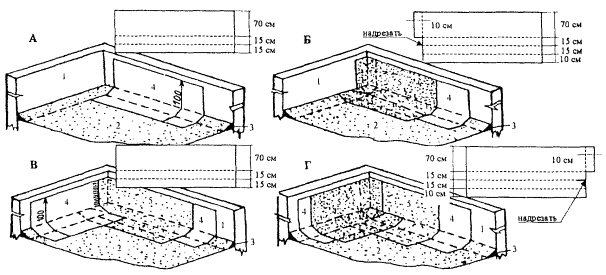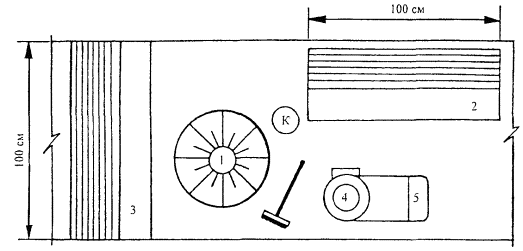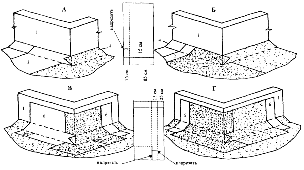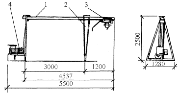 2.15 Очистка основания кровли от мусора и пыли производится с помощью сжатого воздуха. Для этой цели следует применять компрессор СО-62 (СО-7А). 2.16 Раскладка и раскрой полотнищ наплавляемого рулонного материала «Изоэласт» при ремонте кровли в местах примыканий к вертикальным поверхностям во внутренних углах (парапетов) и на поверхности внешних углов (аэрационных фонарей) приведены на рисунках 6 и 7. 2.17 Организация рабочих мест при ремонте кровли в местах примыканий приведена на рисунке 8. 2.18 Для подачи материалов и оборудования применяется крышевой кран К-1М, параметры которого даны на рисунке 9. 3 ТРЕБОВАНИЯ К КАЧЕСТВУ И ПРИЕМКЕ РАБОТ3.1 Контроль качества работ по ремонту кровель должен осуществляться прорабом, мастером и специальными службами, создаваемыми в строительной организации и оснащенными техническими средствами, обеспечивающими необходимую достоверность и полноту контроля. 3.2 Производственный контроль качества работ должен включать входной контроль рабочей документации, конструкций, материалов и оборудования; операционный контроль за выполнением отдельных операций при ремонте кровель и приемочный контроль выполненной кровли. 3.3 При входном контроле рабочей документации производится проверка ее комплектности, достаточности содержащейся в ней технической информации для производства работ. При входном контроле строительных конструкций, изделий, материалов и оборудования проверяются внешним осмотром соответствия их требованиям стандартов или других нормативных документов и рабочей документации, а также наличие паспортов, сертификатов и других сопроводительных документов. Рисунок 6 - Раскладка и раскрой полотнищ наплавляемого рулонного материала при устройстве дополнительного кровельного ковра на поверхности внутреннего угла А, Б, В, Г - последовательность операций 1 - парапет 2 - основной кровельный ковер 3 - переходный наклонный бортик 4 - нижний слой дополнительного ковра 5 - верхний слой (с крупнозернистой посыпкой) дополнительного ковра Рисунок 7 - Раскладка и раскрой полотнищ наплавляемого рулонного материала при устройстве кровельного ковра на поверхности внешнего угла А, Б - для основного кровельного ковра В, Г - для дополнительного кровельного ковра 1 - стена вентшахты 2 - нижний слой основного кровельного ковра 3 - верхний слой (с крупнозернистой посыпкой) основного ковра 4 - наклонный бортик 5 - основной кровельный ковер 6 - нижний слой дополнительного ковра 7 - верхний слой (с крупнозернистой посыпкой) дополнительного ковра Рисунок 8 - Схема организации рабочего места: 1 - воронка водосточной трубы; 2 - рулон мешковины; 3 - рулон рубероида; 4 - бачок для мастики; 5 - тележка; К - рабочее место кровельщика. Рисунок 9 - Крышевой кран К-1М 1, 2 - стойки; 3 - тележка грузовая; 4 - электропривод 3.4 Операционный контроль осуществляется в ходе выполнения работ по ремонту кровли и обеспечивает своевременное выявление дефектов и принятие мер по их устранению и предупреждению. Результаты операционного контроля фиксируется в журнале работ. Основным документом при операционном контроле являются требования СНиП 3.04.01-87. 3.5 При поступлении рулонных и мастичных материалов на объект их образцы проверяют в лаборатории на соответствие физико-механических показателей паспортным данным. 3.6 При приемке выполненных работ по кровле в мес