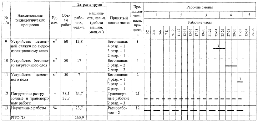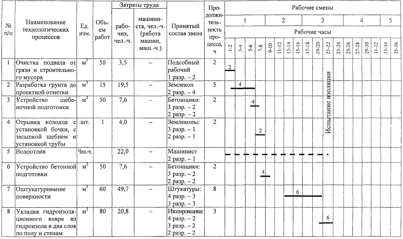 6.4 Технико-экономические показатели приведены ниже: Объем работ по гидроизоляции пола 50 м2 Трудоемкость на весь объем работ 36,2 чел.-дн. Трудоемкость на 100 м2 площади пола подвала 72,4 чел.-дн. Продолжительность работы 4 дня Выработка на одного рабочего в смену 2,5 м2 пола подвала Таблица 3 - График выполнения работ по устройству гидроизоляции в подвальном помещении из рулонного материала гидроизола на общей площади 50 м2