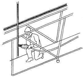 Рисунок 10 - Очистка поверхности стыка Монтажники М1 и М2, находясь в подвесной люльке, очищают поверхность стыка с помощью металлической щетки и шпателя от наплывов бетона, набрызга раствора, снега; влажные поверхности протирают концами или ветошью.