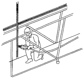 Рисунок 12 - Нанесение нетвердеющей строительной мастики (Бутепрол) (рисунки 2, 3, 4, 5 поз. 8) Монтажник М1 заправляет электрогерметизатор «Стык-20» разогретой мастикой, вводит наконечник электрогерметизатора в стык панелей, нажимает на пусковой рычаг и наносит валик мастики, равномерно перемещая герметизатор вдоль стыка со скоростью, обеспечивающей его полную герметизацию. Толщина валика мастики должна быть не менее 20 мм и не иметь разрывов и наплывов.