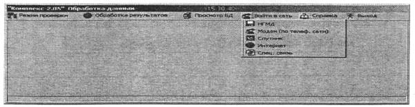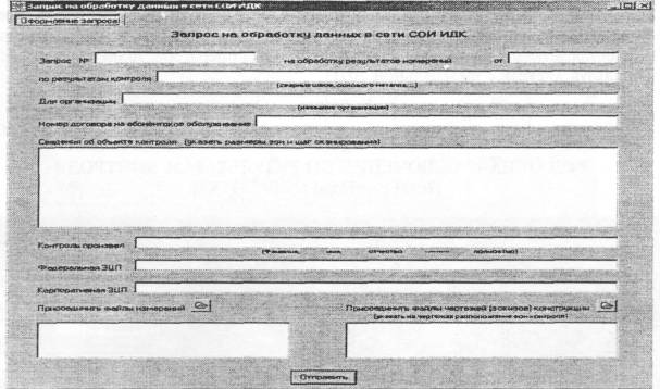 ПРИЛОЖЕНИЕ ЕПОРЯДОК ОБМЕНА ДИАГНОСТИЧЕСКОЙ ИНФОРМАЦИЕЙ МЕЖДУ ОПЕРАТОРОМ И ЦЕНТРОМ ОБРАБОТКИ СЕТИ СОИ ИДКЕ.1 По окончании измерений оператор подключает прибор к ПЭВМ, предварительно подключенный к выбранному средству связи (согласно инструкции по эксплуатации прибора). Е.2 Считывание данных из прибора в ПЭВМ осуществляется согласно инструкции по эксплуатации прибора. Е.3 Для перехода в режим передачи данных в СОИ ИДК для обработки в главном меню Программы «Комплекс-2.05» в окне «Обработка данных» следует выбрать опцию «СОИ ИДК» (рисунок Е.1). Рисунок Е.1 - Окно «Обработка данных» в главном меню Программы «Комплекс-2.05» Е.4 При этом на дисплее ПЭВМ появляется окно следующего вида (рисунок Е.2): Рисунок Е.2 - Меню «Комплекс-2.05. Обработка данных» после выбора опции «СОИ ИДК» Е.5 В меню окна «Комплекс-2.05. Обработка данных» следует выбрать вариант «Войти в сеть». При этом появится ниспадающее меню с вариантами способа передачи информации, доступными оператору (см. рисунок Е.2). Двойным кликом (щелчком) клавиши «мыши» по наименованию способа передачи информации (НГМД, Модем, Спутник и т.д.) следует инициализировать подпрограмму передачи данных. Вновь откроется окно базы данных (см. рисунок Е.1). В нижней части окна клавиши с надписью «Электронная подпись» и «Передача» активируются (надписи станут яркими). Оператор получает возможность предварительного просмотра информации, выбранной для передачи в СОИ ИДК. Е.6 Если при подготовке данных не были введены реквизиты информации («паспорт» участка конструкции и т.п.), то оператору следует заполнить окна формы недостающей информацией (рисунок Е.3). Если требуется сделать специальный запрос (затребовать комментарии к результатам обработки) или сообщить какие-либо особые данные (описание непредвиденной ситуации при измерениях, чертеж и пр.), оператор должен переключить окно обмена в режим ввода текстового сообщения, ввести соответствующий текст. Рисунок Е.3 - Форма подготовки запроса в Центр сети СОИ ИДК Е.7 Если все реквизиты информации, подлежащей обработке в СОИ ИДК, введены правильно, то оператору следует вставить в дисковод дискету с корпоративной электронной подписью и затем нажать кнопку «Отправить» в нижней части (см. рисунок Е.3). Начнется процесс передачи данных по выбранному каналу связи. Е.8 При успешном завершении передачи данных на фоне окна «Комплекс-2.05. Обработка данных» появится информационное окно, подтверждающее завершение передачи, следующего вида (рисунок Е.4): Рисунок Е.4 - Информационное окно, подтверждающее завершение передачи Е.9 Пакет информации автоматически передается в Центр обработки, после чего оператор прерывает работу на ПЭВМ, нажав кнопку «ОК», на время, указанное в информационном окне (время обработки данных и разработки комментариев к результатам обработки). Е.10 Спустя время, необходимое для обработки информации, оператор вновь обращается к окну обмена информацией и клавишей «Прием результатов» подает команду на получение результатов обработки. ПЭВМ автоматически устанавливает связь с Центром обработки и, в случае готовности результатов обработки запроса, записывает в память результаты обработки. Открыть полученную информацию оператор может только с помощью ввода корпоративной электронной подписи. Результат представляется в форме, аналогичной окну, показан