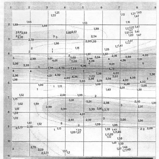 Рисунок И.1 - Пример изображения карты КМН в окрестности сварного шва конструкции на дисплее ПЭВМ оператора Сварной шов (область шва - между 4,5 и 5,5 горизонтальными координатными линиями) имеет КМН с коэффициентом концентрации от 3 до 7,5. Участок сварного шва от точки {5; 3,5} до {5; 8,5}1 имеет КМН с коэффициентом концентрации более 7. 1 Первой указывается координата по горизонтали, второй - по вертикали. В соответствии с принятой классификацией в данном участке сварного шва предполагается наличие особо опасного протяженного дефекта или группы точечных дефектов. Дальнейшая эксплуатация участка конструкции с такими концентраторами недопустима. Для принятия решения о способах РВР необходимо выполнить визуальный осмотр сварного шва. Если видимых признаков дефекта не обнаружено, то целесообразно провести ультразвуковой контроль или рентгеновское просвечивание сварного шва конструкции в данной зоне и принять окончательное решение о возможности отсроченного ремонта и о способах РВР на основании результатов анализа рентгенограмм или ультразвукового контроля. В зоне с координатами от {3; 1} до {3; 4,5} по основному металлу расположен протяженный КМН с коэффициентом концентрации напряжений более 3. В соответствии с принятой классификацией в данном участке данной зоны предполагается наличие опасного группового дефекта или язвенная коррозия с изменением толщины металла. Дальнейшая эксплуатация участка конструкции с таким концентратором возможна, но опасна (из-за особо опасного КМН в сварном шве). Для принятия решения о способах ремонтно-восстановительных работ (РВР) необходимо выполнить визуальный осмотр данного участка данной зоны. Если видимых признаков дефекта не обнаружено, то целесообразно провести ультразвуковой контроль на данном участке данной зоны, толщинометрию и принять окончательное решение о возможности отсроченного ремонта и о способах РВР на основании результатов анализа ультразвукового контроля. В зоне с координатами от {8; 3,5} до {8; 9} по основному металлу расположен протяженный КМН с коэффициентом концентрации напряжений 4. В соответствии с принятой классификацией в данном участке данной зоны предполагается наличие особо опасного группового дефекта или язвенная коррозия с изменением толщины металла. Дальнейшая эксплуатация участка конструкции с таким концентратором недопустима. Для принятия решения о способах РВР необходимо выполнить визуальный осмотр зоны сварного шва. Если видимых признаков дефекта не обнаружено, то целесообразно провести ультразвуковой контроль на данном участке данной зоны, толщинометрию и принять окончательное решение о возможности отсроченного ремонта и о способах РВР на основании результатов анализа ультразвукового контроля. В связи с наличием особо опасного КМН в сварном шве и на участке основного металла с координатами от {8; 3,5} до {8; 9} эксплуатация участка должна быть прекращена до проведения РВР. ПРИЛОЖЕНИЕ КАНАЛИЗ КАРТЫ РГМН С ОБЛАСТЯМИ ПЛАСТИЧЕСКИХ ДЕФОРМАЦИЙ (ОПД) УЧАСТКА КОНСТРУКЦИИ