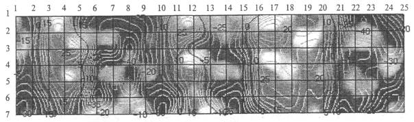 Рисунок К.1 - Пример изображения карты РГМН с областями остаточных пластических деформаций (гофры) конструкции на дисплее ПЭВМ оператора (области между 2 - 5, 10 - 13 и 15 - 21 вертикальными координатными линиями, области остаточных пластических деформаций оконтурены изострессами со значением 0 - на дисплее ПЭВМ красные линии) Участок конструкции находится в состоянии сжатия (области с отрицательными значениями РГМН), зоны гофров испытывают растягивающие напряжения. По границам гофров сформировались пластические напряжения с высоким градиентом, границы областей пластических напряжений изображены линиями с обеих сторон гофров, по которым РГМН изменяет знак. ПРИЛОЖЕНИЕ ЛАНАЛИЗ ВИДА НАПРЯЖЕННО-ДЕФОРМИРОВАННОГО СОСТОЯНИЯ ПО КАРТЕ РГМН УЧАСТКА КОНСТРУКЦИИ