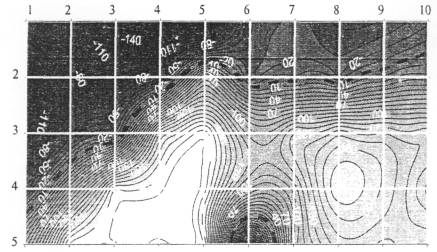 Рисунок Л.1 - Пример изображения карты РГМН со сгущениями (высоким градиентом) изостресс, характерными для кручения На карте РГМН отчетливо виден сформированный поток сгущения изостресс (от точки с координатами {1; 5} до {5; 1}), характерный для кручения конструкции. Направление потока ориентировано примерно под углом 45° по отношению к оси конструкции (ось параллельна горизонтальным координатным линиям разметочной сетки). В окрестности точки с координатами {2; 5} поток принимает направление, характерное для осевого растяжения. Это обусловлено трехкратным увеличением толщины участка конструкции (увеличение жесткости участка конструкции). В точке {5; 6} виден след опасного КМН, характерного для кратера. Окрестность данной точки целесообразно подвергнуть детальному диагностированию. |