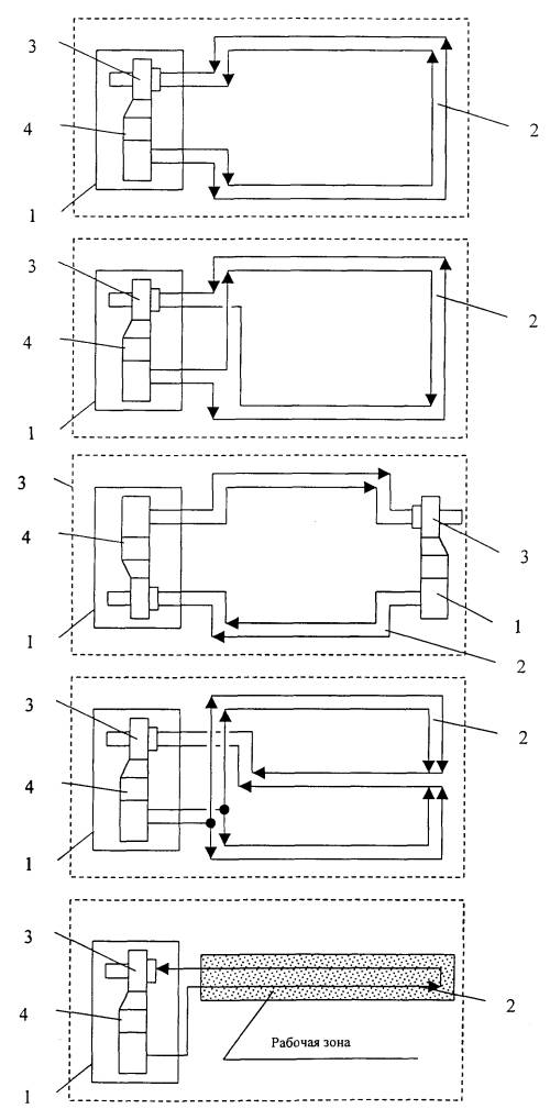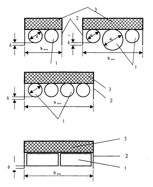 Рис. 2. Конструкции излучателей 1 - теплоизлучающие трубы; 2 - боковые экраны; 3 - тепловая изоляция Схему (в) рекомендуется использовать, если аэродинамическое сопротивление контура в расчетном режиме превышает располагаемой давление одного циркуляционного вентилятора. Движение теплоносителя в теплоизлучающих трубах может быть параллельным или встречным. Схему (г), с количеством параллельных ветвей более 2-х, целесообразно использовать в многопролетных цехах; при этом подающие ветви размещаются по периметру наружных стен, обратные линии - в середине пролетов. Количество ветвей в системе определяется расчетом, в зависимости от требуемой площади теплоотдающей поверхности (см. раздел 3). Для обеспечения равномерного распределения лучистого теплового потока по площади цеха расстояние между ветвями в центральной части помещения следует принимать в соответствии с условием: l £ 0,9(hизл - 1) (1) В пристенной зоне расстояние между двумя крайними лентами излучателей и крайней лентой излучателей и наружной стеной должно быть уменьшено вдвое (рис. 3). Для протяженных зданий с фиксированной рабочей зоной излучатели могут размещаться в одну линию, непосредственно над рабочей зоной (схема б). При выборе схем и трассировке ветвей следует учитывать наличие источников и стоков тепла вблизи рабочих зон (тепловыделяющего оборудования, ворот, окон). 2.5. Выбор конструкции излучателя и числа теплоизлучающих труб в нем производится, исходя из требуемой поверхности теплоотдачи (раздел 3), конструктивных возможностей их размещения и эстетических соображений. При этом следует руководствоваться данными таблицы 1. Таблица 1
