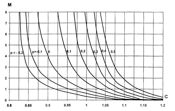 3. РАСЧЕТ СИСТЕМЫ ОТОПЛЕНИЯ3.1. Расчет включает: определение тепловой нагрузки на систему лучистого отопления; определение площади тепло излучающей поверхности; выбор конструкции излучателей; определение расхода и перепада температур теплоносителя; аэродинамический расчет сети теплоизлучающих труб; определение расчетного расхода газа и среднегодового потребления теплоты и газа. 3.2. Основные тепло потери здания Q, Вт, и расхода теплоты на нагревание ин-фильтрующегося воздуха Qи, Вт, определяются в соответствии с [5]. Расчетная температура внутреннего воздуха помещения принимается в соответствии с [1 - 3]. 3.3. Расчетная тепловая нагрузка на систему лучистого отопления определяется по формуле: QS = C(Q + Qи - Qвн) (2) где Qвн - тепловыделения от людей и оборудования (включая теплопоступления от вспомогательных, например, дежурных систем отопления), Вт; В величину Qвн включается часть тепловой нагрузки системы вентиляции. Q*вент = 0,28Gвент(tпр - tв) (3) * Величина Qвент при условии tпр < tв может быть отрицательной. В этом случае она вычитается из Qвн. где Qвент - расход вентиляционного воздуха, кг/ч; tпр - температура приточного воздуха. В формуле (2) поправочный коэффициент «С» учитывает возможное снижение температуры внутреннего воздуха в рабочей (обслуживаемой) зоне и ее распределение по высоте помещения при лучистом отоплении. Значение коэффициента «С» определяется по графику на рис. 4 в зависимости от комплексных показателей Р и М. Показатель Р, 1/ч, определяется по формуле: