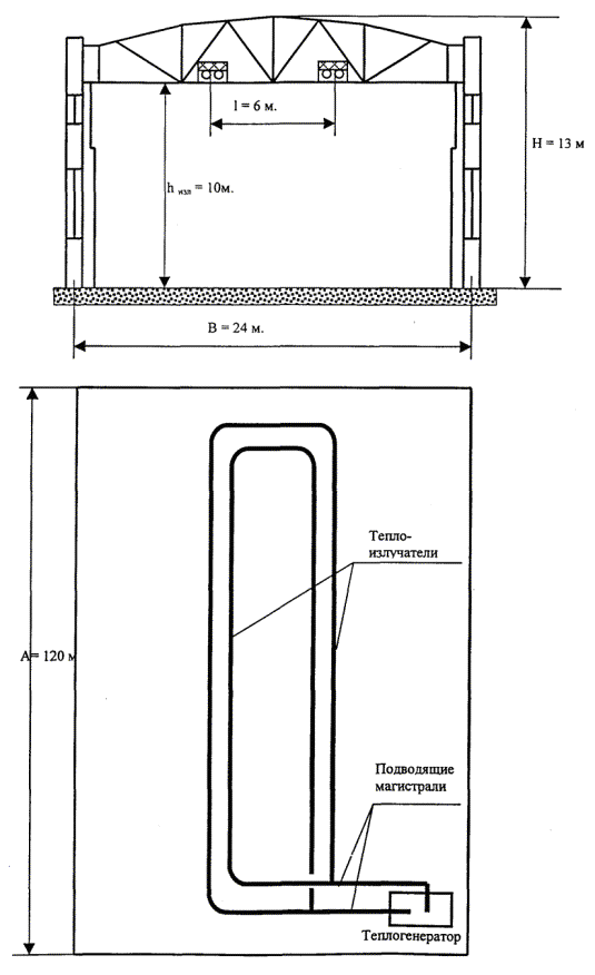 по графику на рис. 7 при 3.8. Выбирается схема размещения излучателей в соответствии с требуемым количеством теплогенераторов и рекомендациями п. 2.4. Определяется требуемая поверхность теплоотдачи 1 п.м. излучателя: