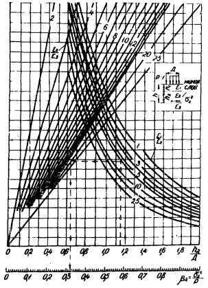 Рис. 4.3. Номограмма для определения динамических изгибающих напряжений от подвижной нагрузки Рис. 4.4. Номограмма для определения функции b2 (по М.Б. Корсунскому) ПРИЛОЖЕНИЕ 5Пример расчета дорожной одеждыТребуется рассчитать дорожную одежду с асфальтобетонным покрытием для дороги, устраиваемой в насыпи высотой до 1,5 м в Омской обл. (III дорожно-климатическая зона, 3-й тип местности по характеру увлажнения). Грунты земляного полотна - суглинки тяжелые. Ширина проезжей части - 7,5 м, интенсивность движения на второй год эксплуатации 840 авт/сутки. Начальная интенсивность движения 600 авт/сутки. Ежегодный прирост интенсивности g = 0,13. Расчетная скорость транспортного потока - 60 км/ч. Состав движения характеризуется следующими данными: Грузовые автомобили с нагрузкой на заднюю ось, т % до 7........................................................................................................................ 10,0 до 8,4..................................................................................................................... 12,0 до 9,2..................................................................................................................... 6,6 до 10...................................................................................................................... 10,0 Легковые............................................................................................................... 61,4 1. Общий срок службы дорожной одежды до капитального ремонта принимаем 15 лет (по табл. 1 «Методических рекомендаций»), тогда она должна работать в стадии обратимых деформаций 2 года. 2. Назначаем предварительно конструкцию одежды: покрытие: верхний слой - асфальтобетон горячий (тип «А») - 5 см; нижний слой - асфальтобетон пористый - 10 см; основание щебеночное (щебень 1-го класса прочности) - 25 см; подстилающий слой - песок крупнозернистый - 20 см; земляное полотно - суглинок тяжелый. Расчетная схема