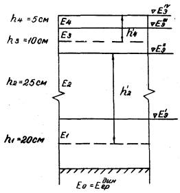 где g - ежегодный прирост интенсивности движения относительно единицы; Kg - коэффициент учета доли расчетных автомобилей в потоке (табл. 1.1 приложения 1). 2.8. Динамические модули материалов покрытия, основания и грунтов земляного полотна назначаются с учетом изменения температурно-влажностного режима и продолжительности действия нагрузки (приложение 2). 2.9. Эквивалентный динамический модуль упругости системы «грунт земляного полотна - основание» определяют в следующем порядке (рис. 1): определяют