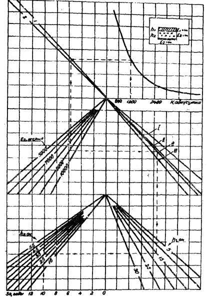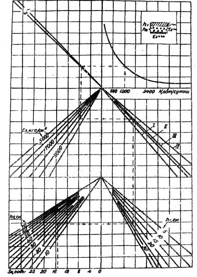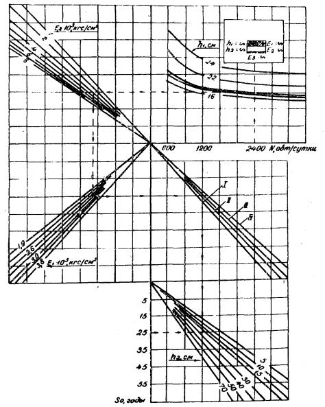 х) Потенциальная энергия учтена за 4 дня апреля и 3 дня ноября. ПРИЛОЖЕНИЕ 6Ускоренный метод расчета дорожных одеждТолщины покрытий и оснований одежд нежесткого типа назначают по номограммам рис. 6.1 и 6.2 приложения 6, предварительно установив интенсивность движения, модуль упругости основания, срок работы одежды в стадии обратимых деформаций. В номограммах обусловлено, что в транспортном потоке доля расчетных автомобилей составляет 30 % (на каждые 10 % изменения этой доли в любую сторону интенсивность по номограммам соответственно изменяется на 7 %). Номограммы составлены для проектирования дорожных одежд с покрытиями из горячего асфальтобетона в условиях 3-го типа местности по характеру увлажнения. При проектировании дорожных одежд для 2-го типа местности полученные значения оснований уменьшают на 20 %, а для 1-го типа местности - на 40 %. Например, в условиях Омской обл. требуется назначить толщины покрытия и основания дороги IV категории при интенсивности движении 600 авт/сутки и при 30 % расчетных автомобилей в транспортном потоке, а также дороги III категории при интенсивности 1200 авт/сутки с таким же составом движения. Покрытие устраивают из крупнозернистого горячего асфальтобетона на щебеночном основании с модулем упругости 6000 кгс/см2 или на цементогрунтовом с таким же модулем упругости. Общий срок службы дорожной одежды принимаем равным 10 годам, тогда по номограммам рис. 6.1 и 6.2 приложения 6 получим варианты, которые приведены в табл. 6.1 данного приложения. Рис. 6.1. Номограмма для назначения толщин асфальтобетонного покрытия h1, и дискретного основания h2 по заданному сроку эксплуатации одежды до капитального ремонта: So для различных дорожно-климатических зон (I - IV) 1 и 2 - соответственно крупно- и среднезернистые асфальтобетоны Рис. 6.2. Номограмма для назначения толщин асфальтобетонного покрытия h1 и монолитного основания h2 по заданному сроку эксплуатации одежды до капитального ремонта So для различных дорожно-климатических зон (I - IV), 1, 2 - соответственно крупно- и среднезернистые асфальтобетоны Таблица 6.1