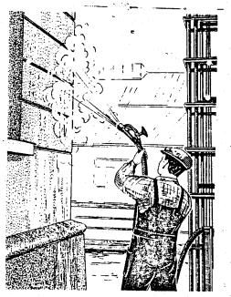 Примечания: 1. Механик-водитель и компрессорщик в состав звена ЖЭКа или ремонтно-строительного треста не входят и не предусматриваются нормами. 2. Ремонт облицовки производится облицовщиком-плиточником IV разряда. 3.2. При промывке фасадов водой оба рабочих выполняют одну и ту же операцию по промывке участков на смежных захватках; механик-водитель обслуживает вышку. 3.3. Промывка производится отдельными захватками; при периодическом опускании вышки (люльки) работы начинаются с верхних этажей и продолжаются вниз. 3.4. Ширина вертикальных захваток принимается от 2 до 4 м, в зависимости от размеров рабочей площадки подъемного устройства. 3.5. При пескоструйной и гидропескоструйной очистке пескоструйщик IV разряда производит непосредственную очистку фасада. При гидропескоструйной очистке подсобный рабочий обеспечивает пескоструйный аппарат сухим просеянным песком, регулирует подачу песка, а также обеспечивает подачу воды к соплу. При пескоструйной очистке пескоструйщик III разряда обеспечивает пескоструйный аппарат сухим просеянным песком, регулирует подачу песка и заменяет пескоструйщика IV разряда во время его отдыха. Компрессорщик следит за работой компрессора и обеспечивает подачу сжатого воздуха в пескоструйный аппарат, механик-водитель обслуживает вышку. 3.6. При очистке гладких поверхностей фасада сопло перемещается в вертикальном направлении, а при обработке горизонтальных архитектурных деталей (тяг, карнизов, рустов) - в горизонтальном. 3.7. Работы по гидропескоструйной очистке производятся снизу вверх отдельными захватками при постепенном подъеме вышки (люльки). 3.8. После окончания гидропескоструйной очистки верхнего этажа производят промывку очищенных участков водой при движении рабочей площадки вышки (люльки) вниз. А. Последовательность и приемы выполнения основных рабочих операций. Таблица 4