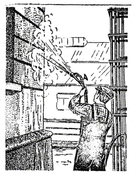 Примечания: 1. Механик-водитель и компрессорщик в состав звена ЖЭКа или ремонтно-строительного треста не входят и не предусматриваются нормами. 2. Ремонт поврежденных участков производится штукатуром-маляром IV разряда. 3.2. При промывке фасадов водой оба рабочих выполняют одну и ту же операцию по промывке участков на смежных захватках; механик-водитель обслуживает вышку. Промывка производится сверху вниз отдельными захватками. 3.3. Ширина вертикальных захваток принимается от 2 до 4 м в зависимости от размеров рабочей площадки подъемного устройства. 3.4. При гидропескоструйной очистке пескоструйщик производит непосредственную очистку фасада; подсобный рабочий обеспечивает пескоструйный аппарат сухим просеянным песком, регулирует подачу песка, а также регулирует подачу воды к соплу; компрессорщик следит за работой компрессора и регулирует подачу сжатого воздуха в пескоструйный аппарат; механик-водитель обслуживает вышку. 3.5. При очистке гладких поверхностей фасада сопло перемещается в вертикальном направлении, а при обработке горизонтальных архитектурных деталей (тяг, карнизов, рустов) - в горизонтальном. 3.6. Работы по гидропескоструйной очистке производятся снизу вверх отдельными захватками при постепенном подъеме вышки (люльки). 3.7. После окончания гидропескоструйной очистки верхнего этажа производят промывку очищенных участков водой при движении рабочей площадки вышки (люльки) вниз. А. Последовательность и приемы выполнения основных рабочих операций. Таблица 3