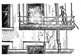 I. Область применения1.1. Настоящая технологическая карта предназначена для работников жилищных и ремонтно-строительных организаций как руководство по организации и выполнению работ по очистке от загрязнений фасадов зданий, окрашенных перхлорвиниловыми красками, с последующим ремонтом поврежденных участков при проведении текущего ремонта жилых домов, находящихся в эксплуатации. 1.2. В карте дано описание схем очистки, основных средств механизации для производства работ по очистке фасадов, приемов труда рабочих, основных правил техники безопасности. 1.3. Привязка типовой технологической карты к местным условиям проведения текущего ремонта выполняется путем уточнения состава и объемов ремонтных работ, потребности в материальных ресурсах и составления калькуляции трудовых затрат на фактический объем работ по нормам, приведенным в технологической карте с учетом соответствующих примечаний. II. Организация и технология ремонтного процессаА. Условия и подготовка процесса 2.1. Для повышения срока службы зданий, окрашенных перхлорвиниловыми красками, и улучшения их внешнего вида необходимо не реже одного раза в три года в летние месяцы производить очистку фасадов от загрязнений с одновременным ремонтом разрушенных участков. 2.2. С целью правильной организации работ и лучшего использования средств механизации очистку фасадов рекомендуется производить на магистралях (по улицам, кварталам). 2.3. Очистка и промывка фасадов допускается при температуре воздуха не ниже +10 °С. 2.4. Для производства работ по очистке и ремонту фасадов применяются шарнирные двухсекционные вышки Ш2-СВ-14 и Ш2-СВ-18, телескопические вышки ВИ-23, а также механизированные люльки конструкции треста «Фасадремстрой», самоподъемные люльки конструкции Мосжилуправления и конструкции ДСК-2 Главленинградстроя (рис. 4 - 9). 2.5. Для страховки рабочих при падении подвесных люлек, а также для закрепления на страховочном тросе работающих с люльки служат ловители (рис. 10, 11). 2.6. До начала работ по очистке фасадов должен быть произведен ремонт кровли над карнизами, водосточных труб, покрытий парапетов, наружных оконных переплетов и дверей. Б. Технология выполнения ремонтных работ 2.7. Счистку фасадов от загрязнений рекомендуется производить следующими способами: чистой водой; водой с песком (гидропескоструйная очистка) при сильном загрязнении фасада, когда промывка водой не достигает нужного эффекта (например, когда здания расположены вблизи от промышленных предприятий, когда фасад не промывался в течение длительного времени и др.). а) Промывка фасадов водой 2.8. Промывку водой производят из шланга, подключенного к домовому водопроводу. Для промывки верхних этажей (начиная с третьего) рекомендуется подавать воду под давлением 2 - 3 атм. С этой целью между водопроводом и насосом устанавливается бак. Из водопровода вода поступает в этот бак, а из него насосом подается на фасад. При использовании вышек Ш2-СВ-14 и Ш2-СВ-18 насос и бак монтируются на ходовой части этих вышек. При использовании телескопических автовышек насос и бак можно установить непосредственно в кузове автомашины. Промывка производится до полного удаления загрязнения. 2.9. При невозможности удаления загрязнений на отдельных участках они промываются водой с одновременным протиранием волосяными щетками или швабрами.