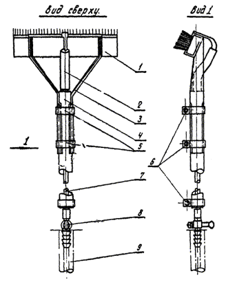 Примечание. Инструменты и механизмы для ремонта поврежденных участков приводятся в технологической карте № 5. Рис. 1. Промывка фасада водой с применением щетинной щетки конструкции ЛНИИ АКХ. Рис. 2. Гидропескоструйная очистка фасада. Рис. 3. Промывка водой очищенных участков после гидропескоструйной очистки. Рис. 4. Шарнирная двухсекционная вышка 1 - ходовая часть, 2 - поворотная часть, 3 - выносные опоры, 4 - подъемное устройство, 5 - нижняя секция мачты, 6 - верхняя секция мачты, 7 - люлька, 8 - пульт управления Рис. 5. Шарнирная двухсекционная вышка Ш2СВ-18 1 - ходовая часть, 2 - поворотная часть, 3 - выносные опоры, 4 - подъемное устройство, 5 - нижняя секция мачты, 6 - верхняя секция мачты, 7 - люлька Рис. 6. Телескопическая вышка ВИ-23 на автомобиле ЗИЛ-157. 1 - рабочая кабина вышки, 2 - телескопическая часть вышки, 3 - лебедка, 4 - опорный домкрат, 5 - кронштейны, 6 - кузов автомобиля Рис. 7. Самоподъемная электрифицированная люлька Фасадремстроя-1 1 - консольные балки, 2 - подъемные блоки, 3 - люлька, 4 - грузовые канаты, 5 - страховой канат, 6 - тормоза, 7 - редуктор, 8 - рама платформы перевозной тележки, 9 - электродвигатель, 10 - грузовые барабаны лебедки, 11 - страховой барабан лебедки Рис. 8. Люлька самоподъемная конструкции Мосжилуправления Рис. 9. Люлька самоподъемная двухместная конструкции ДСК-2 Главленинградстроя 1 - металлоконструкции люльки; 2 - электрооборудование; 3 - упор отключающий; 4 - ловитель; 5 - лебедка Рис. 10. Ловитель для страховки рабочих при падении провесных люлек. Предложение Г.С. Петрова, А.Б. Гуслякова 1 - страховочный трос Æ 8 мм; 2 - корпус обоймы; 3 - пружина; 4 - рукоять рычага; 5 - отверстие Æ 16 мм; 6 - эксцентриковый кулачок. Рис. 11. Ловитель для закрепления на страховочном тросе работающих с подвесной люльки. Предложение Е.А. Сиревича. 1 - рычаг; 2 - карабин; 3 - ловитель; 4 - страховочный трос. Рис. 12. Щетка для промывки фасадов зданий. 1 - щетка, 2 - шланг Æ 8 l = 120 мм, 3 - оправа, 4 - рукоятка, 5 - хомутик, 6 - болт М6´30, 7 - трубка, 8 - кран запорный, 9 - шланг Æ 9. Рис. 13. Приспособление для гидропескоструйной очистки фасадов зданий 1 - резиновый шланг; 2 - тройник; 3 - кран запорный; 4 - шланг для песка; 5 - штуцер для подвода воды; 6 - шланг для подвода воды; 7 - сменный наконечник; 8 - корпус водяной рубашки; 9 - трубка; 10 - прокладка; 11 - распылитель Рис. 14. Схема гидропескоструйной очистки 1 - компрессор, 2 - шланг диаметром 25 мм, 3 - шланг диаметром 15 мм, 4 - пескоструйный аппарат, 5 - бак с водой, 6 - шланг диаметром 32 мм, 7 - шланг диаметром 16 мм, 8 - сопла, 9 - обрабатываемая поверхность. Рис. 15. Серая шкала ЛНИИ АКХ. СОДЕРЖАНИЕ