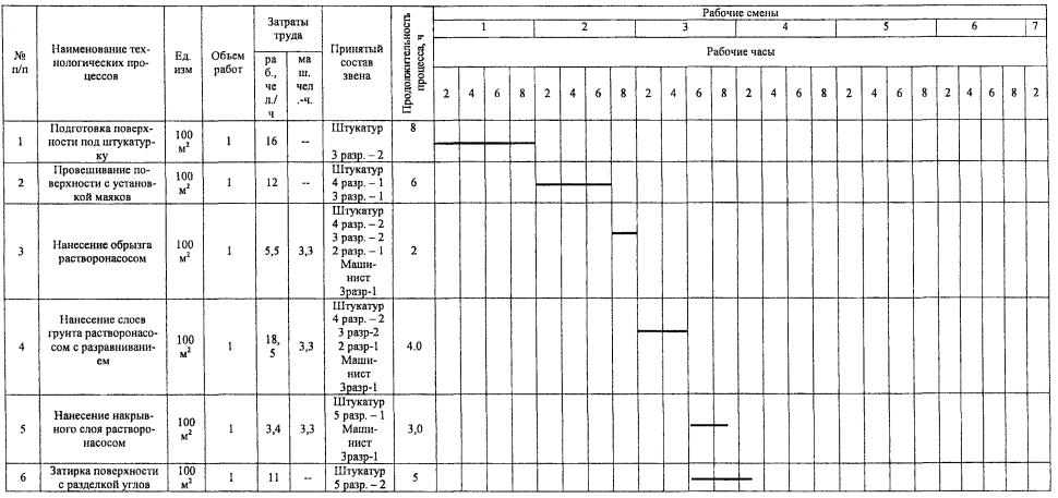 6 ТЕХНИКО-ЭКОНОМИЧЕСКИЕ ПОКАЗАТЕЛИ6.1 Калькуляция затрат труда составлена на процесс высококачественного оштукатуривания стен, включающего в себя операции по провешиванию поверхности, подлежащей оштукатуриванию, нанесению обрызга, нанесению грунта с разравниванием, затирки поверхности, установке и снятию правил (при разделке узлов), подбору отскоков раствора с наброской его на поверхность вручную, перестановке рукавов по ходу работ, нанесению накрывочного слоя, установке инвентарных маяков или устройству их из раствора, нанесению второго слоя грунта с разравниванием и снятием инвентарных маяков или вырубки маяков из раствора. 6.2 Трудоемкость выполнения работ по устройству штукатурных покрытий фасадов, характеризующая использование материально-технических и трудовых ресурсов, определена в калькуляции затрат труда и машинного времени по «Единым нормам и расценкам на строительные, монтажные и ремонтно-строительные работы», введенным в действие в 1987 г. и представлена в таблице 10. 6.3 В качестве единицы измерения для составления калькуляции затрат труда и машинного времени и построения календарного плана производства работ принято выполнение высококачественной штукатурки на 100 м поверхности фасада. 6.4 Продолжительность работ на устройство штукатурных покрытий фасадов определяется календарным планом работ, представленным в таблице 10. Технико-экономические показатели составляют: - затраты труда, чел.-час......................................................... 66,4 - затраты машинного времени, маш.-ч................................. 9,9 - продолжительность работ, час............................................ 25 Таблица 10 - Калькуляция затрат труда на производство работ по устройству высококачественной штукатурки фасадов Измеритель конечной продукции - 100 м3 поверхности