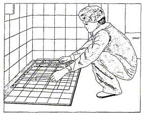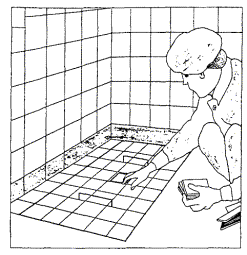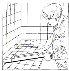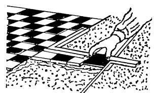 Рисунок 18 - Осаживание плитки полутерком Рисунок 19 - Снятие шаблона 2.40 Применяют для устройства полов также мелкую керамическую плитку, наклеенную лицевой поверхностью на бумажные листы по определенному рисунку (листы ковровой мозаики). 2.41 Полы из ковровой мозаики настилают по бетонному подстилающему слою на прослойке из раствора марки 150, поверхность которой припорашивают сухим цементом для прочного сцепления плиток с прослойкой. Карты ковровой мозаики укладывают на прослойку бумагой вверх с зазором между смежными картами 2 мм. 2.42 С поверхности настланного пола после твердения раствора через 2 - 3 дня бумагу смачивают водой и счищают. Швы заливают жидким цементным раствором. После схватывания раствора полы протирают влажными опилками, а затем промывают. 2.43 Плитки приклеивают на цементном растворе, густых цинковых белилах, битумно-силикатной и глино-битумной мастиках или на специальных составах с добавками полимерных связующих (поливинилацетатной дисперсии, эпоксидной или карбамидной смол). 3 ТРЕБОВАНИЯ К КАЧЕСТВУ И ПРИЕМКЕ РАБОТ3.1 При производстве работ по устройству покрытий полов необходимо вести строгий контроль качества применяемых материалов, соблюдения технологии выполнения работ и ухода за законченными покрытиями. Преждевременная нагрузка (эксплуатация) полов может нарушить процессы схватывания (сцепления) покрытия с основанием и привести к его деформации. Пешеходное движение по покрытиям из штучных материалов, уложенных на прослойки из цементно-песчаной растворной смеси может быть разрешено не ранее достижения предела прочности при сжатии величины 2,5 МПа (25 кгс/см2). 3.2 Контроль качества работ осуществляют на всех стадиях технологической цепи, начиная от разработки проекта и кончая его реализацией на объекте на основе ППР и технологических карт. Приемке подлежат законченные устройства каждого элемента пола, выполненные в соответствии с проектом. Приемка производится до устройства вышележащих элементов пола. 3.3 Производственный контроль осуществляют бригады, работники строительных лабораторий, а также представители технадзора заказчика, проектного института, инспекции государственного архитектурно-строительного контроля, оснащенными техническими средствами, обеспечивающими необходимую достоверность и полноту контроля. 3.4 Производственный контроль качества строительно-монтажных работ должен включать входной контроль рабочей документации, конструкций, изделий, материалов и оборудования, операционный контроль отдельных строительных процессов или производственных операций и приемочный контроль строительно-монтажных работ. 3.5 При входном контроле рабочей документации должна производиться проверка ее комплектности и достаточности содержащейся в ней технической информации для производства работ. При входном контроле строительных конструкций, изделий, материалов и оборудования следует проверять внешним осмотром их соответствие требованиям стандартов или других нормативных документов и рабочей документации, а также наличие и содержание паспортов, сертификатов и других сопроводительных документов. 3.6 Допускаемые размеры плиток не должны превышать указанных в таблице 1 допусков. Таблица 1 - Допускаемые отклонения размеров керамической плитки
