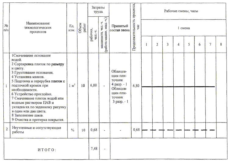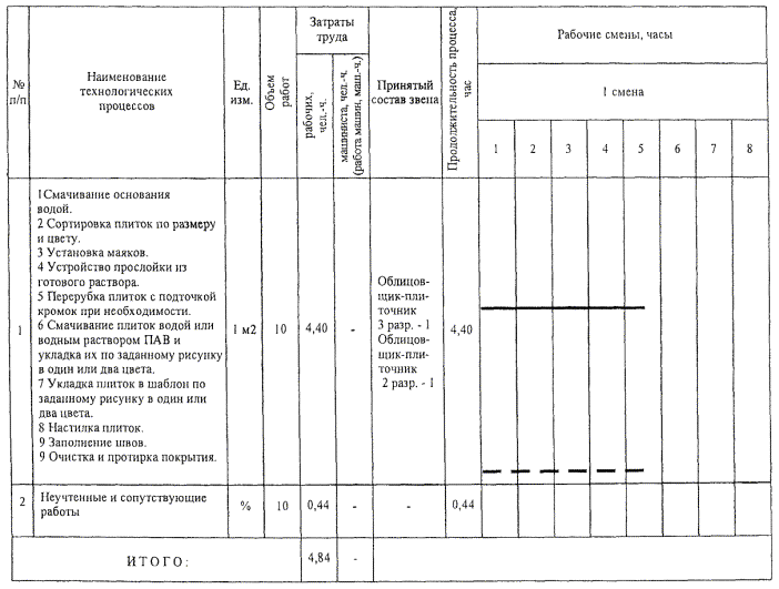 Таблица 6 - Калькуляция затрат труда и машинного времени при настилке керамических плиток размером 150´150 мм пакетным способом Измеритель конечной продукции - 10 м2 основания