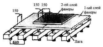 2.13.12 На установленные в соответствии с приведенными выше указаниями лаги уложить влагостойкую фанеру толщиной 10 мм в 2 слоя, причем второй слой фанеры должен перекрывать швы первого слоя. Фанеру закрепить к лагам и между собой саморезами. Шаг между саморезами 150 мм.