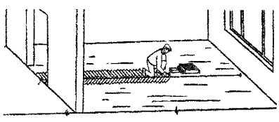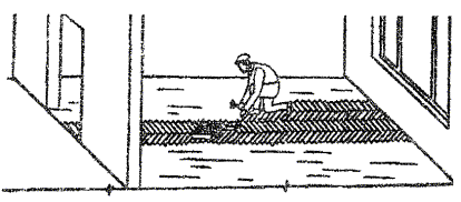 2.12.5 На фанеру настилают штучный паркет соответствующего рисунка (в «елку» и т.п.), при этом независимо от настилки составляют план раскладки паркета, чтобы выбрать планки оптимального размера для каждого помещения. 2.12.6 Планки штучного паркета крепятся к фанере водостойкими мастиками или клеями. 2.12.7 Настилку паркета начинают с маячного ряда, укладываемого по шнуру, который в больших помещениях прокладывают через середину. Центральное положение маячного ряда обеспечивает правильность рисунка и дает возможность вести настилку паркета одновременно в двух направлениях. В небольших помещениях площадью до 20 м2, имеющих строго прямоугольный план и ровные стены, маячный ряд можно укладывать у длинной, наиболее отдаленной от входа стены. 2.12.8 Паркет настилают в соответствии с принятым рисунком вплотную к ранее уложенному маячному ряду и тщательно втапливают в предварительно нанесенный слой клея или мастики на фанеру. Смежные планки штучного паркета соединяют между собой в шпунт путем их сплачивания специальным паркетным молотком со скошенным носком. Зазоры между планками паркетного покрытия не должны превышать 0,3 мм. 2.12.9 Площадь приклейки планок штучного паркета, определяемая при их пробных приподниманиях, должна составлять не менее 80 % площади планки. 2.12.10 При настилке паркета между покрытием пола и стенами (перегородками) следует оставлять зазоры 10 ... 15 мм, чтобы покрытие в период эксплуатации могло «дышать», предохраняя покрытие от вспучивания в случае разбухания при увлажнении пола. В эти зазоры через 50 ... 60 см вставляют деревянные вкладыши (клинья) для временного закрепления настланного пола, что обеспечивает неподвижность покрытия в период твердения мастики. 2.12.11 В местах примыкания полов к стенам, перегородкам, колоннам, трубопроводам и другим конструкциям, выступающим над полом, следует устанавливать плинтусы (галтели). 2.12.12 Для соединения паркета с порогом или другим видом покрытия пола (керамическая плитка, линолеум и др.) необходимо использовать металлические накладные полосы. Крепить их необходимо к основанию пола, а не к паркету. Можно также использовать дубовые раскладки. 2.12.13 Не ранее чем через 3 суток после наклейки паркета покрытие шлифуют. 2.12.14 После шлифовки паркета все вкладыши (клинья) по периметру помещения удаляют и устанавливают плинтуса. По требованию проекта между паркетным покрытием и стеной (перегородкой) могут быть установлены звукоизолирующие прокладки из древесноволокнистых плит. Плинтусы крепятся гвоздями или шурупами к стенам в предварительно установленные пробки или пластиковые дюбели с шагом 800 - 1200 мм, но не менее двух на один плинтус. Плинтусы следует прибить к стене так, чтобы они плотно прилегали к паркету, но не стопорили покрытие пола. Небольшие трещины и зазоры заделать грунтовочной краской подходящего цвета. Деревянные пробки или пластиковые дюбели установить до устройства покрытия пола. Если в стены (перегородки) можно забить гвозди, крепление плинтуса или галтели производить без установки пробок. 2.12.15 Настилку штучного паркета выполняют в следующей технологической последовательности: - паркетные планки сортируют по внешнему виду (цветовым оттенкам) и размерам (длине, ширине, толщине). Осматривают паркетные планки с точки зрения их прямоугольности, наличия правых и левых гре