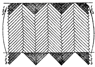 2.13.16 От уложенного первого звена паркетных планок продолжить укладку маячной «елки» строго по шнуру, сплачивая планки молотком.