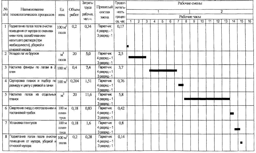 6.3 Календарный график производства работ представлен в таблице 8. Таблица 8 - Календарный график производства работ Измеритель конечной продукции - 20 м2 пола 6.4 На основании таблиц 7 и 8 определены основные технико-экономические показатели на измеритель конечной продукции: Продолжительность работ на 20 м2, часы 14,28 Количество работающих в смену в максимальный период, чел. 2 Затраты труда, чел.-ч. - на измеритель конечной продукции (на 20 м2) 28,56 - на 1 м2 покрытия пола 1,43 Выработка на 1 рабочего в смену, м2 покрытия пола 5,6 7 ПЕРЕЧЕНЬ ИСПОЛЬЗОВАННОЙ НОРМАТИВНО-ТЕХНИЧЕСКОЙ ЛИТЕРАТУРЫ1 СНиП 2.03.13-88. Полы. 2 СНиП 3.01.01-85*. Организация строительного производства. Издание 1995 г. 3 СНиП 3.04.01-87. Изоляционные и отделочные покрытия. 4 СНиП 12-03-2001. Безопасность труда в строительстве. Часть 1. Общие требования. 5 СНиП 12-04-2002. Безопасность труда в строительстве. Часть 2. Строительное производство. 6 СНиП 23-05-95. Естественное и искусственное освещение. 7 ГОСТ 12.0.004-90. ССБТ. Организация обучения безопасности труда. Общие положения. 8 ГОСТ 12.1.004-91*. ССБТ. Пожарная безопасность. Общие требования. 9 ГОСТ 862.1-85. Изделия паркетные. Паркет штучный. Технические условия. 10 ГОСТ 3916.1-96. Фанера общего назначения с наружными слоями из шпона лиственных пород. Общие технические условия. 11 ГОСТ 9685-61*. Заготовки из древесины хвойных пород. Технические условия. 12 ВСН 9-94. «Инструкция по устройству полов в жилых и общественных зданиях». Департамент строительства, Научно-техническое управление, 1995 г. 13 Единые нормы и расценки на строительные, монтажные и ремонтно-строительные работы. Сборник Е19. Устройство полов. 14 Единые нормы и расценки на строительные, монтажные и ремонтно-строительные работы. Сборник Е20. Ремонтно-строительные работы. Выпуск 1. Здания и промышленные сооружения. 15 ПОТ РМ-016-2001. «Межотраслевые правила по охране труда (правила безопасности) при эксплуатации электроустановок», М., 2001 г. 16 ППБ 01-03. Правила пожарной безопасности в Российской Федерации. 17 Рекомендации по устройству полов. АО «ЦНИИПРОМЗДАНИЙ», 1998 г. 18 СП 12-135-2003. Безопасность труда в строительстве. Отраслевые типовые инструкции по охране труда. |