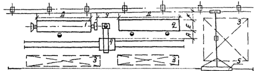 рис. 3. Размещение стендов, кантователей для сварки крупногабаритных узлов: 1 - двухстоечный кантователь; 2 - стенд для сборки; 3 - место складирования; 4 - универсальная площадка для сварщика с подвижной стрелой; 5 - полукозловой кран. Таблица 16