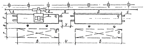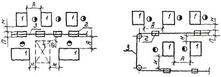 Рис. 12. Размещение подвесных конвейеров: 1 - оборудование; 2 - подвеска; 3 - конвейер; 4 - склад. Таблица 25