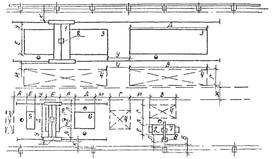 Рис. 5. Размещение установок автоматической сварки и резки с поворотными колоннами и самоходными порталами: 1 - портал самоходный; 2 - автомат сварочный или резак; 3 - универсальный цепной кантователь или стол термической резки; 4 - место складирования; 5 - стенд; 6 - роликовый стенд; 7 - кантователь; 8 - поворотная колонна. Таблица 18
