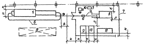 Рис. 6. Размещение оборудования для электронно-лучевой сварки: 1 - моечно-сушильный агрегат; 2 - установка для размагничивания; 3 - пресс для запрессовки; 4 - монорельс; 5 - установка для электронно-лучевой сварки; 6 - подвесной грузонесущий конвейер; 7 - ограждающие элементы помещения для электронно-лучевой сварки; 8 - место складирования; 9, 10, 11 - шкафы управления и источники питания. Примечание. Размеры уточняются по паспортным данным оборудования. Таблица 19
