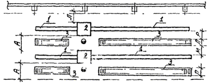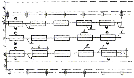 Рис. 11. Размещение напольных конвейеров: 1 - напольный конвейер; 2 - стол, оборудование. Таблица 24